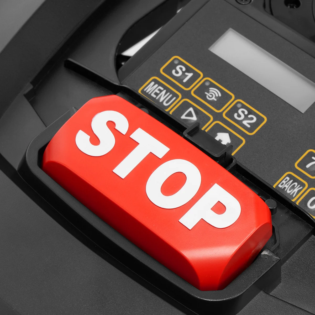 - Экстренная остановка — при помощи кнопки «Стоп» можно мгновенно прекратить работу косилки при необходимости.