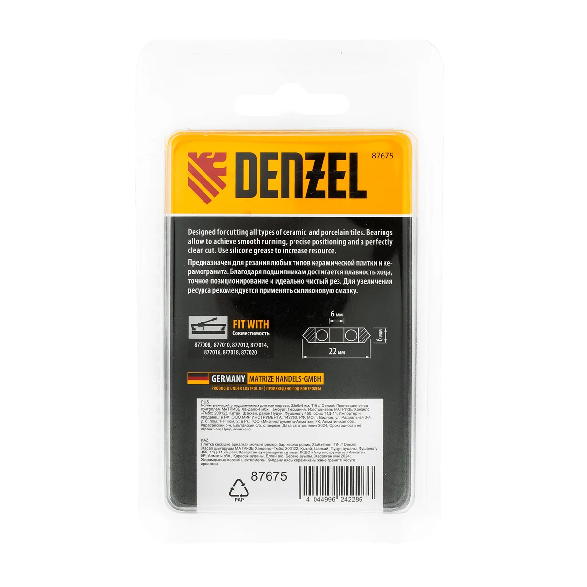 Режущий ролик Denzel 87675 размером 22 x 6 x 6 мм, с подшипником, — сменный рабочий элемент для плиткореза. Быстро режет керамическую плитку и керамогранит, подшипник обеспечивает плавный ход. Пригодится во время выполнения отделочных работ.