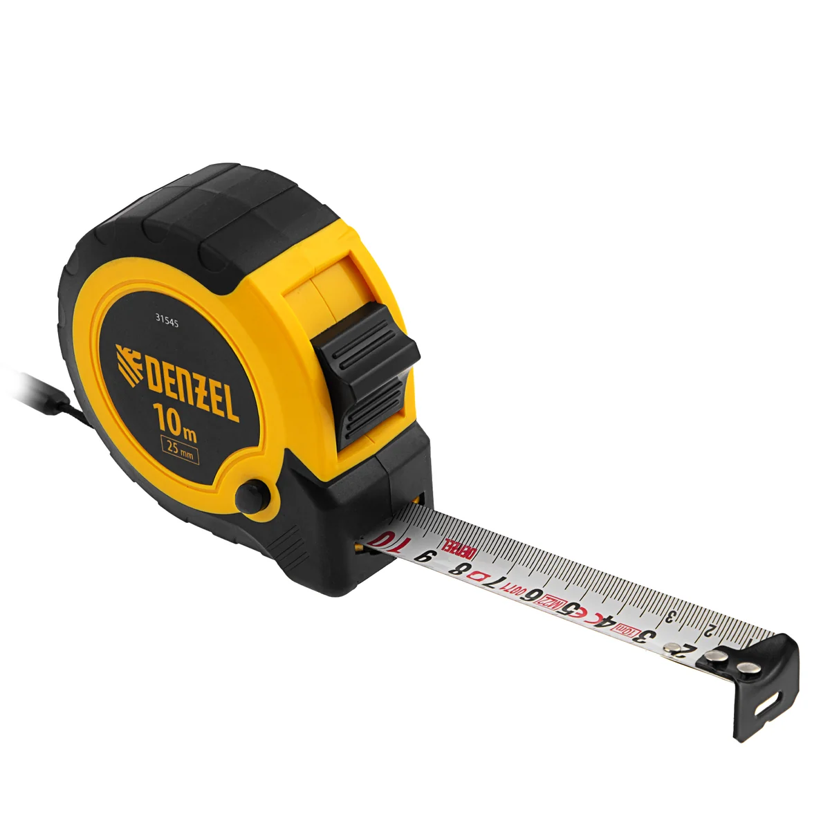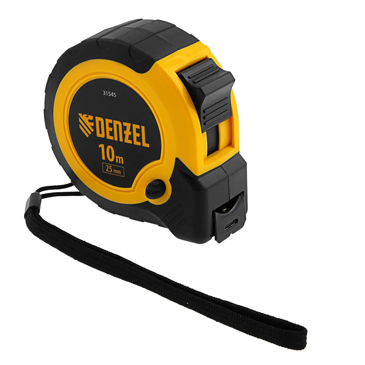 Рулетка Denzel 31545 в двухкомпонентном корпусе, с кнопкой-паузой, с полотном шириной 25 мм и длиной 10 м, используется для измерения расстояний и размеров предметов. Удобна для работы в труднодоступных местах. Стальная лента с эмалевым покрытием и защитной пластиной в месте крепления зацепа рассчитана на долгий срок службы. Рулетка будет полезна во время строительства и ремонта, а также пригодится в быту.ПреимуществаУдаропрочность — двухкомпонентный корпус из ABS-пластика и вставками из термопластичной резины устойчив к механическим повреждениям.Удобная эксплуатация — клавиша-фиксатор удерживает ленту в вытянутом положении, облегчая проведение измерений.Эргономичность — рулетка снабжена прочным ремешком для подвешивания на запястье.Дополнительные возможности — поясной зажим позволяет закрепить рулетку на ремне, чтобы освободить руки во время работы.Продуманная упаковка — открытый блистер позволяет осмотреть изделие перед покупкой.