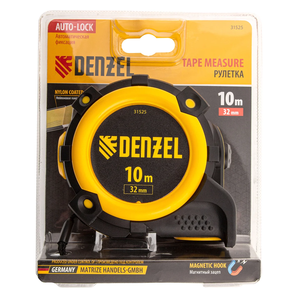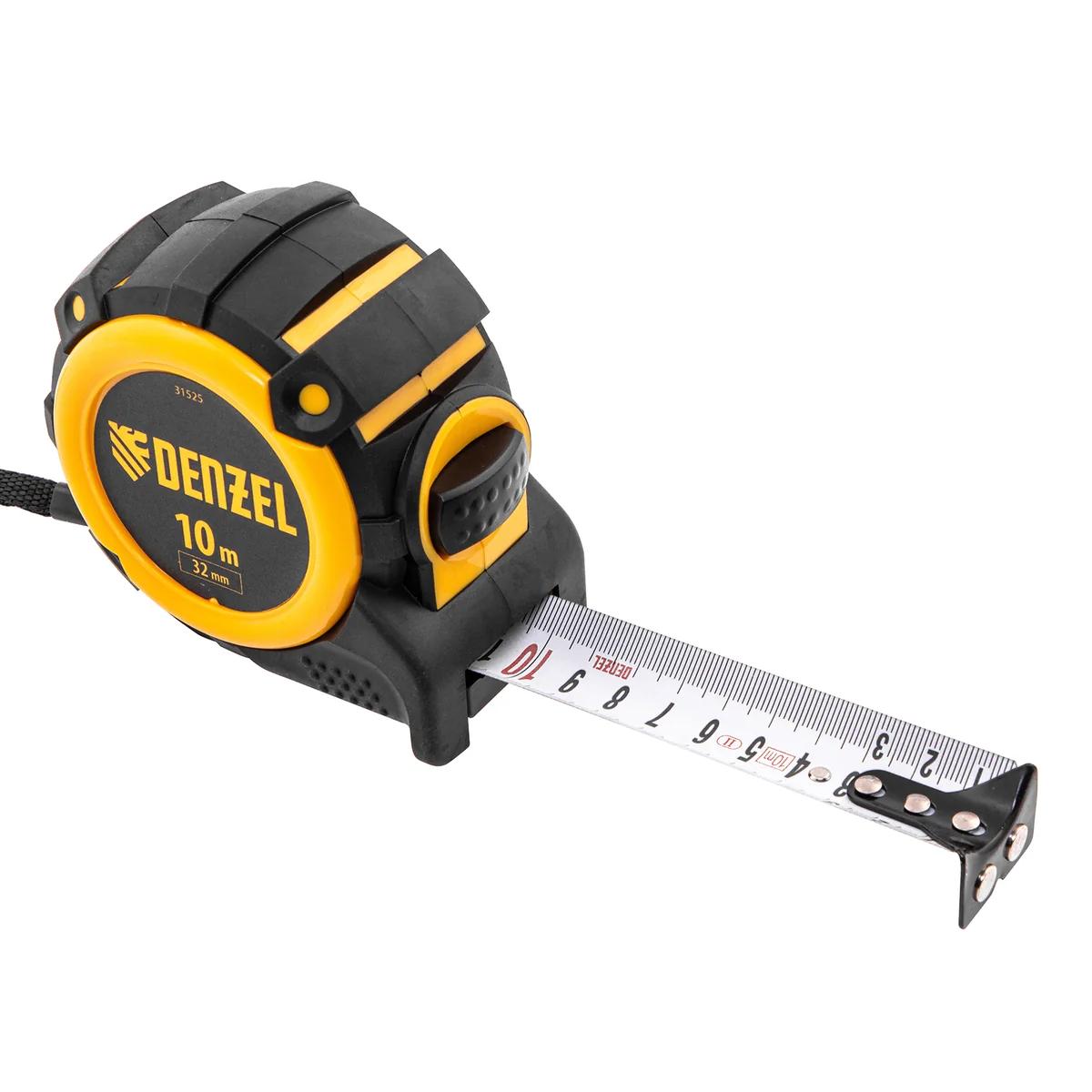 Рулетка Denzel 31525 с автоматической фиксацией полотна размером 10 м х 32 мм, с нейлоновым покрытием, магнитным зацепом и двухсторонней разметкой, предназначена для измерения расстояний и определения габаритов различных предметов. Лента автоматически фиксируется в вытянутом положении, что упрощает работу. Рулетка удобна для работы в труднодоступных местах, будет полезна во время строительных и ремонтных работ.ПреимуществаПрочность — двухкомпонентный корпус изготовлен из ABS-пластика и термопластичной резины, что снижает риск его поломки в результате случайного падения или удара.Четкая шкала — измерительное полотно с нейлоновым покрытием устойчиво к истиранию.Функциональность — магнитный зацеп надежно фиксируется на металлических поверхностях.Проведение измерений в разных плоскостях — на ленту нанесена двухсторонняя разметка (вертикальная и горизонтальная шкала).Эргономичность — у рулетки имеется 2 кнопки возврата измерительной ленты, что ускоряет работу.