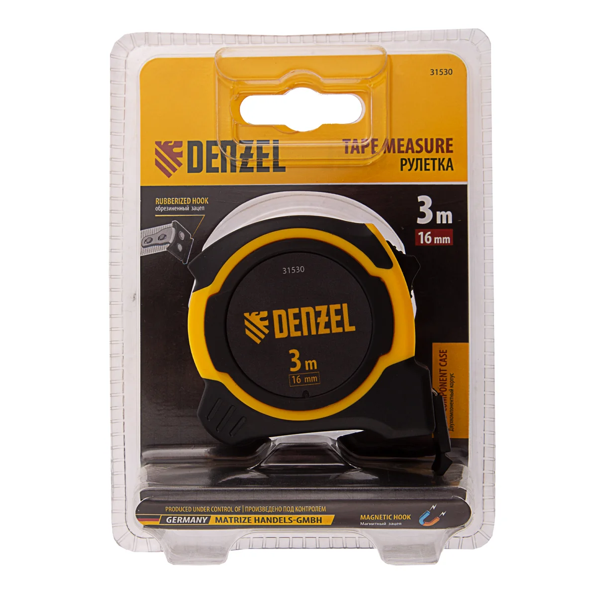 Рулетка Denzel 31530 в двухкомпонентном корпусе, с измерительной лентой шириной 16 мм и магнитным обрезиненным зацепом, позволяет определять размеры предметов и расстояния до 3 м. Будет полезна при проведении строительных, ремонтных и различных бытовых работ.ПреимуществаПрочность — двухкомпонентный корпус из ABS-пластика с вставками из термопластичной резины устойчив к поломкам в результате случайных падений или ударов.Функциональность — обрезиненный зацеп с 2 магнитами надежно фиксируется на округлых и металлических предметах.Надежность — стальная лента с эмалевым покрытием и защитной пластиной в месте крепления зацепа выдерживает интенсивное использование.Удобная фиксация на ремне — рулетка дополнена поясным зажимом.Продуманная упаковка — изделие поставляется в открытом двойном блистере, позволяющем осмотреть его перед покупкой.