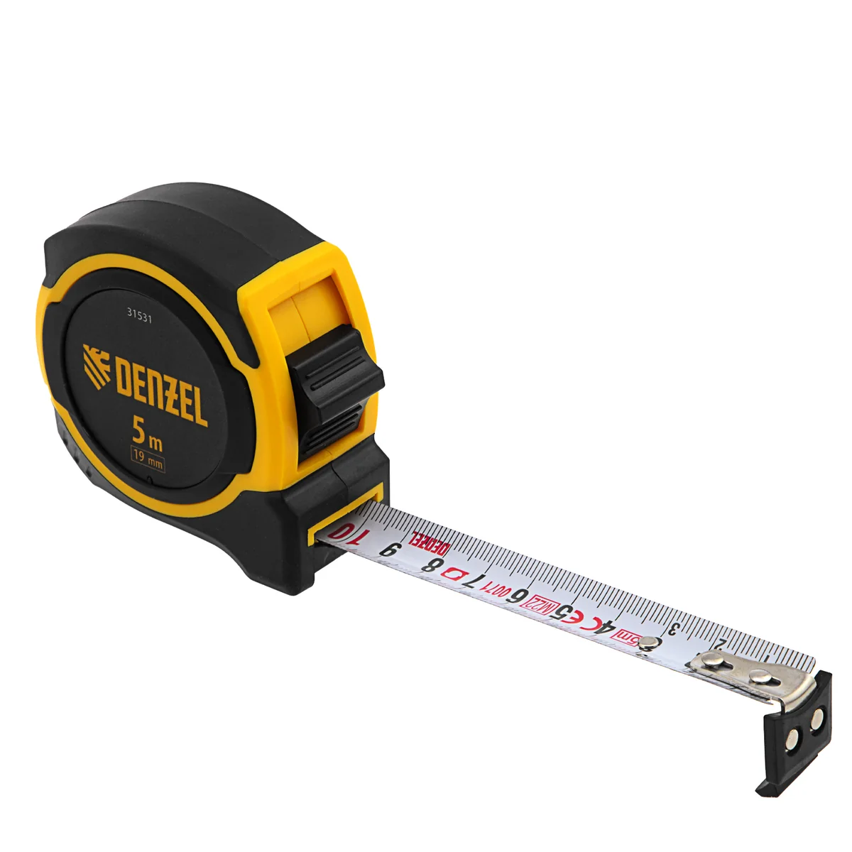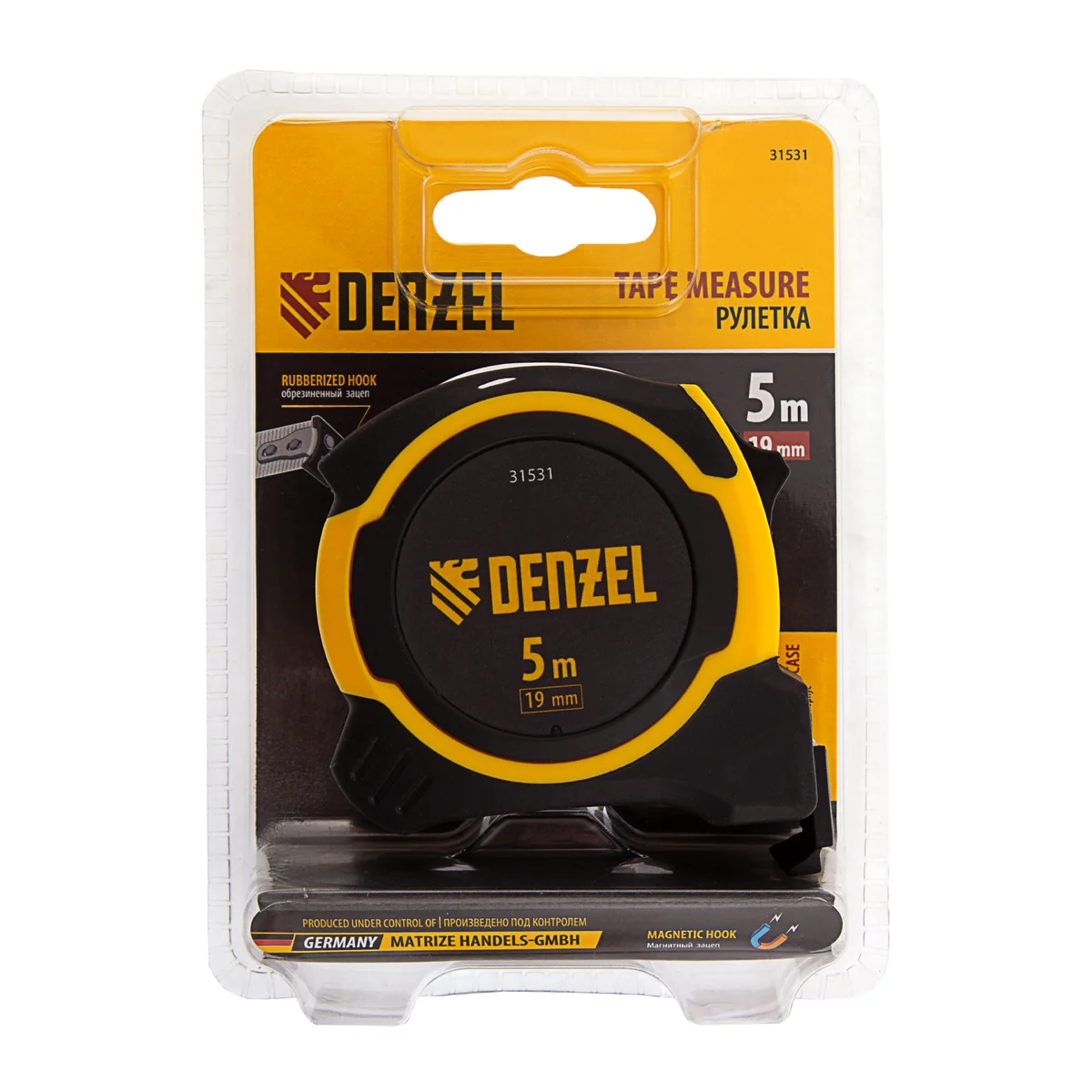 Рулетка Denzel 31531 в двухкомпонентном корпусе, с измерительной лентой шириной 16 мм и магнитным обрезиненным зацепом, позволяет определять размеры предметов и расстояния до 5 м. Будет полезна при проведении строительных, ремонтных и различных бытовых работ.ПреимуществаПрочность — двухкомпонентный корпус из ABS-пластика с вставками из термопластичной резины устойчив к поломкам в результате случайных падений или ударов.Функциональность — обрезиненный зацеп с 2 магнитами надежно фиксируется на округлых и металлических предметах.Надежность — стальная лента с эмалевым покрытием и защитной пластиной в месте крепления зацепа выдерживает интенсивное использование.Удобная фиксация на ремне — рулетка дополнена поясным зажимом.Продуманная упаковка — изделие поставляется в открытом двойном блистере, позволяющем осмотреть его перед покупкой.