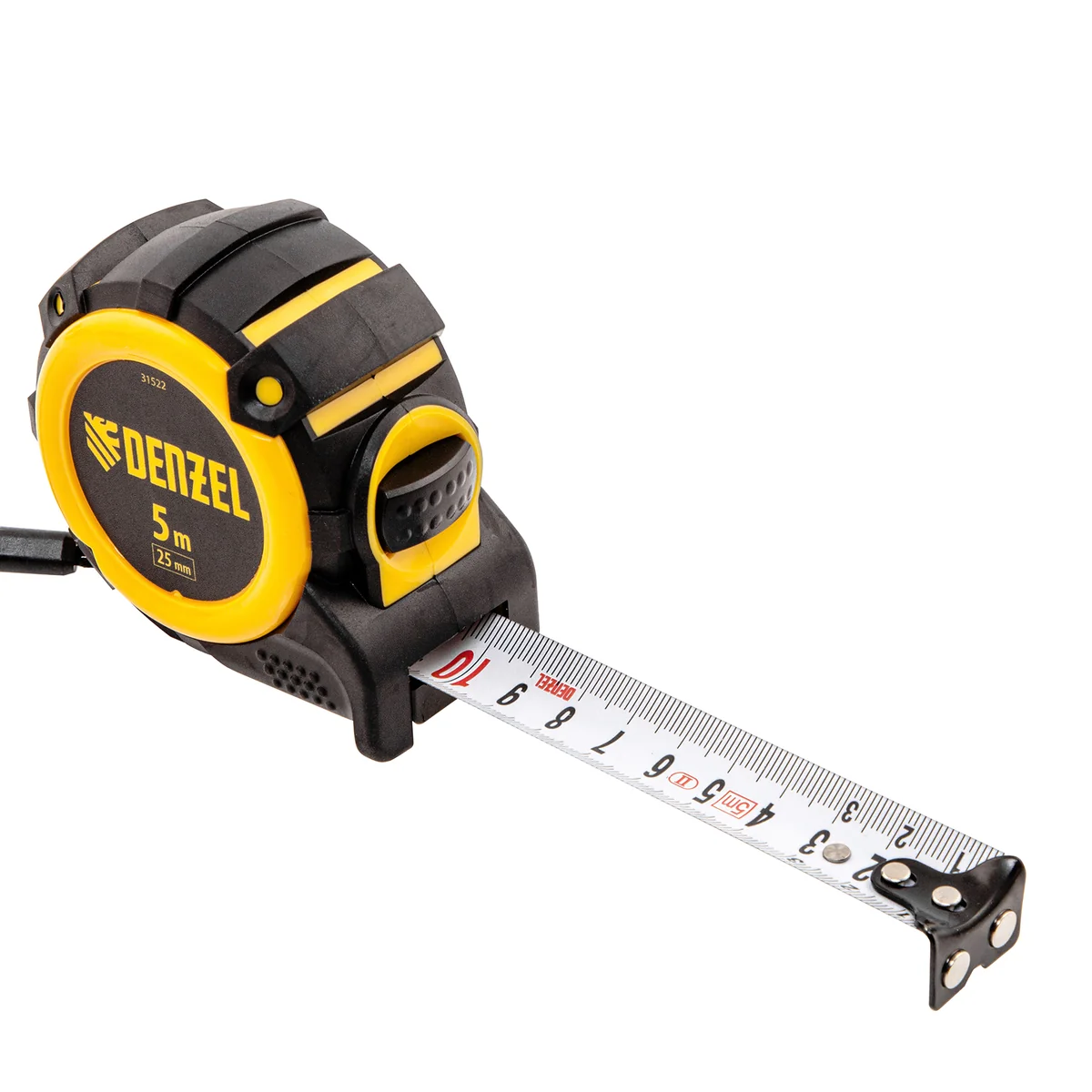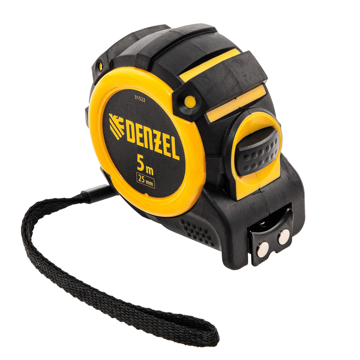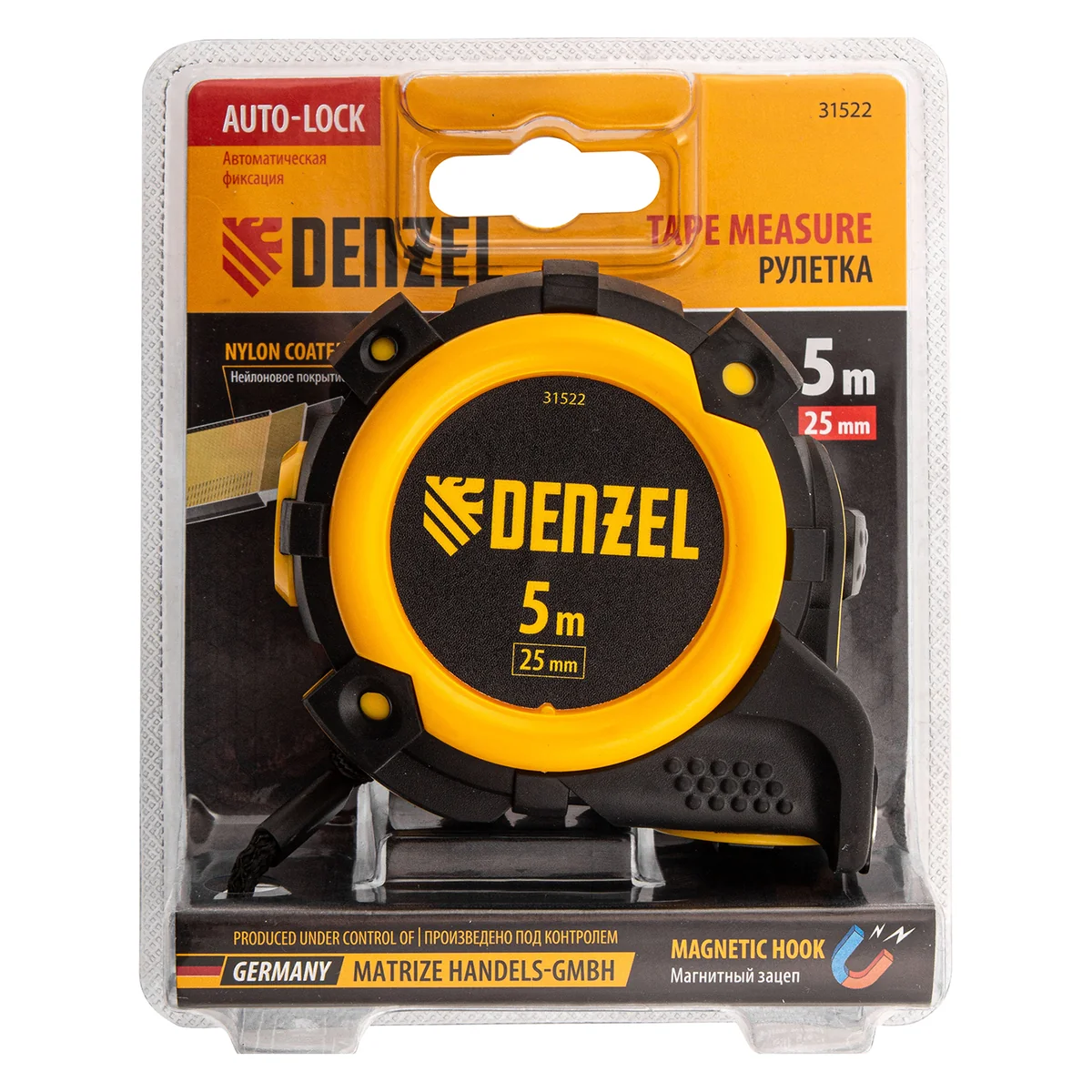Рулетка Denzel 31522 с автоматической фиксацией полотна размером 5 м х 25 мм, с нейлоновым покрытием, магнитным зацепом и двухсторонней разметкой, предназначена для измерения расстояний и определения габаритов различных предметов. Лента автоматически фиксируется в вытянутом положении, что упрощает работу. Рулетка удобна для работы в труднодоступных местах, будет полезна во время строительных и ремонтных работ.ПреимуществаПрочность — двухкомпонентный корпус изготовлен из ABS-пластика и термопластичной резины, что снижает риск его поломки в результате случайного падения или удара.Четкая шкала — измерительное полотно с нейлоновым покрытием устойчиво к истиранию.Функциональность — магнитный зацеп надежно фиксируется на металлических поверхностях.Проведение измерений в разных плоскостях — на ленту нанесена двухсторонняя разметка (вертикальная и горизонтальная шкала).Эргономичность — у рулетки имеется 2 кнопки возврата измерительной ленты, что ускоряет работу.
