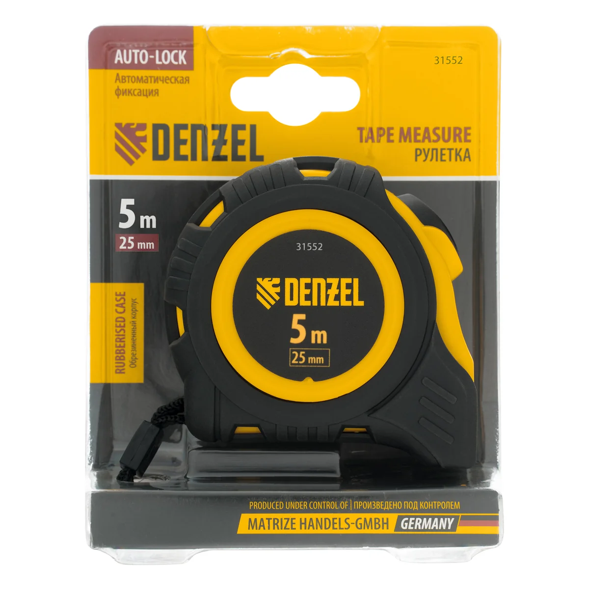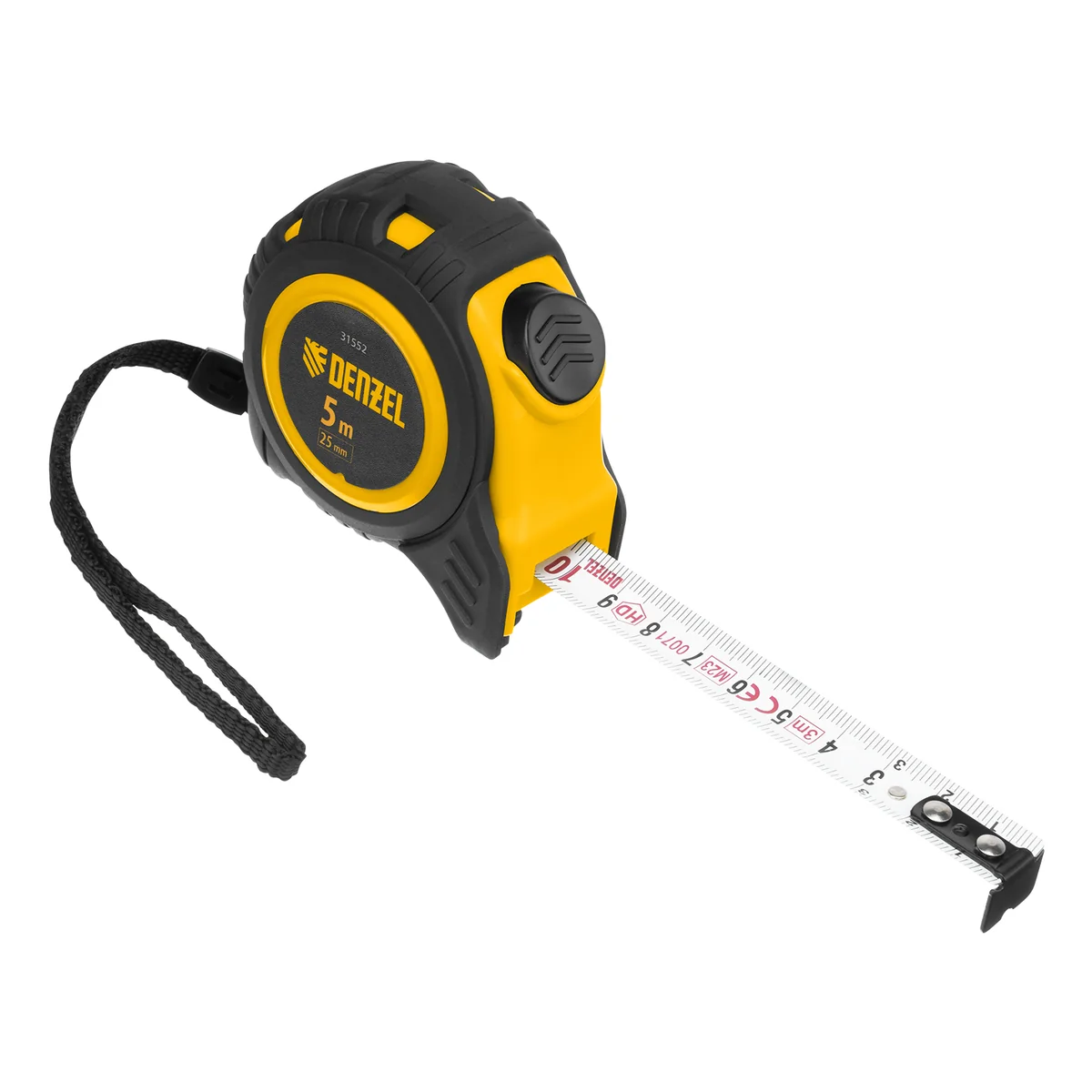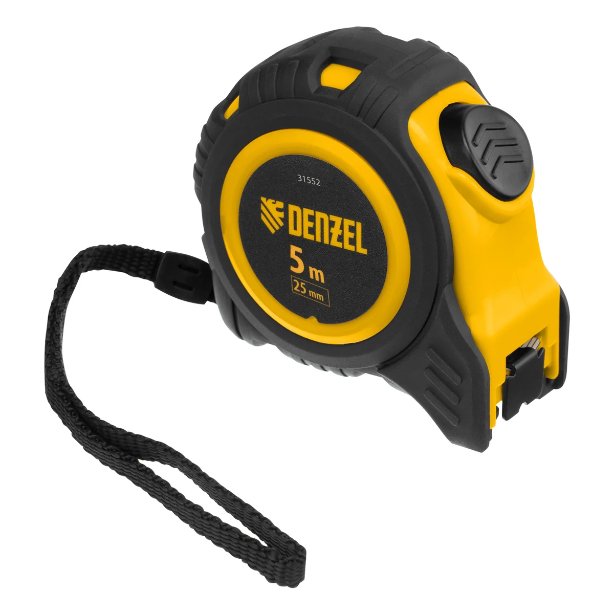 Рулетка Denzel 31552 в обрезиненном корпусе, с автоматической фиксацией, с полотном шириной 25 мм и длиной 5 м, используется для измерения расстояний и размеров предметов. Стальная лента с эмалевым покрытием и защитной пластиной в месте крепления зацепа рассчитана на долгий срок службы. Рулетка будет полезна во время строительства и ремонта, а также пригодится в быту.ПреимуществаУдаропрочность — обрезиненный корпус устойчив к механическим повреждениям.Удобная эксплуатация — автоматическая фиксация удерживает ленту в вытянутом положении, облегчая проведение измерений.Повышенный срок службы - конструкция прижимного механизма оснащена обрезиненным фиксатором в форме конуса (вращение происходит вместе с лентой).Эргономичность — рулетка снабжена прочным ремешком для подвешивания на запястье.Дополнительные возможности — поясной зажим позволяет закрепить рулетку на ремне, чтобы освободить руки во время работы.Продуманная упаковка — открытый блистер позволяет осмотреть изделие перед покупкой.