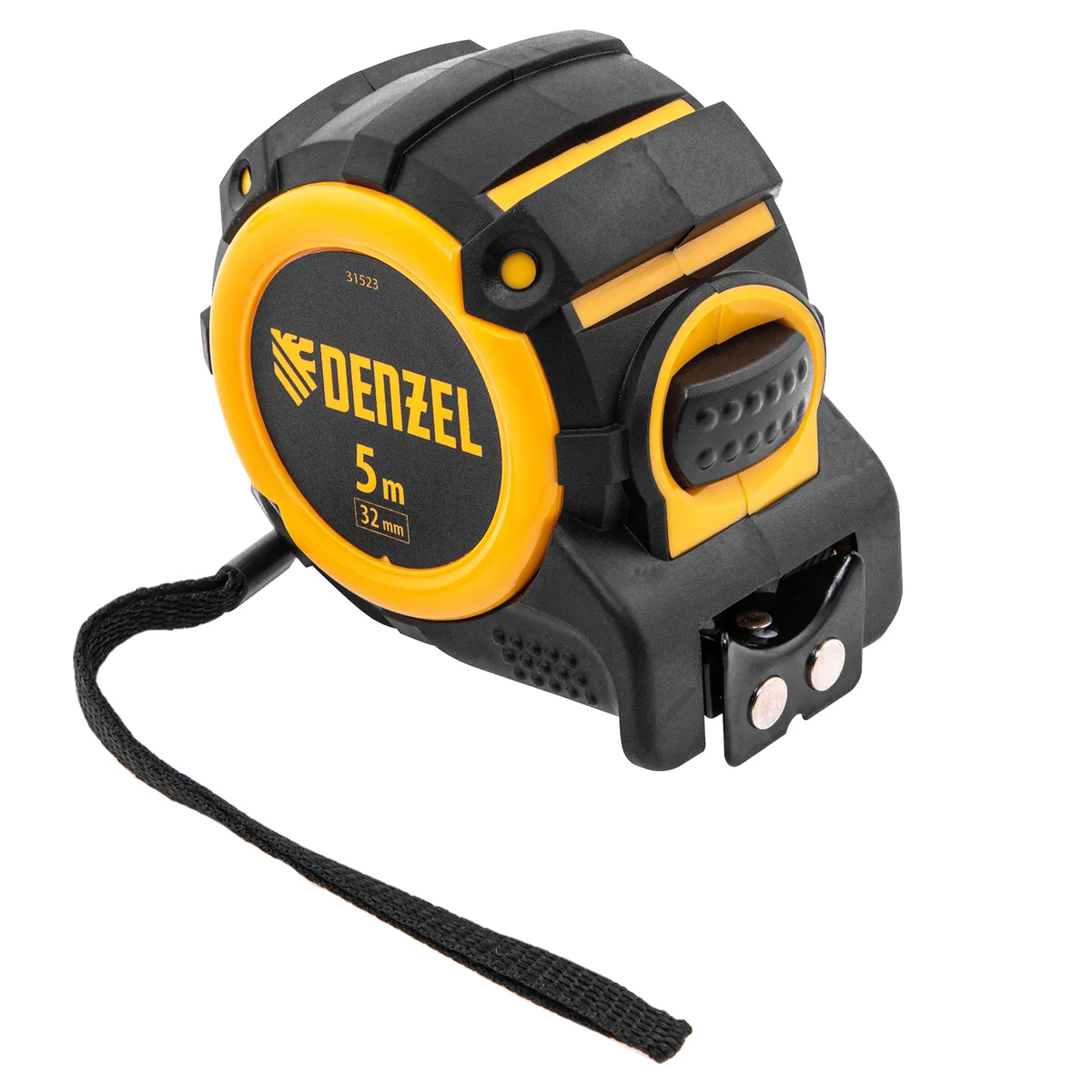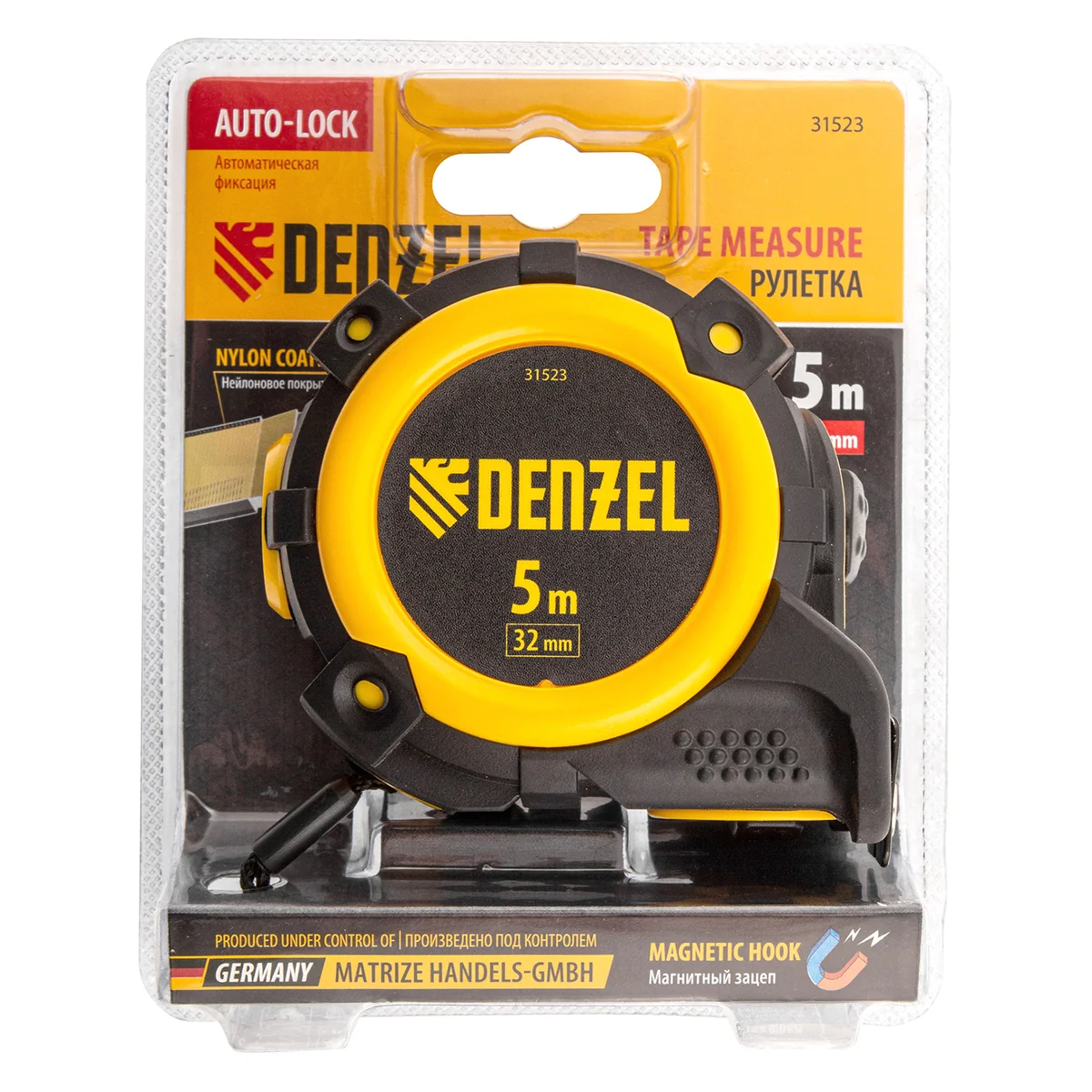 Рулетка Denzel 31523 с автоматической фиксацией полотна размером 5 м х 32 мм, с нейлоновым покрытием, магнитным зацепом и двухсторонней разметкой, предназначена для измерения расстояний и определения габаритов различных предметов. Лента автоматически фиксируется в вытянутом положении, что упрощает работу. Рулетка удобна для работы в труднодоступных местах, будет полезна во время строительных и ремонтных работ.ПреимуществаПрочность — двухкомпонентный корпус изготовлен из ABS-пластика и термопластичной резины, что снижает риск его поломки в результате случайного падения или удара.Четкая шкала — измерительное полотно с нейлоновым покрытием устойчиво к истиранию.Функциональность — магнитный зацеп надежно фиксируется на металлических поверхностях.Проведение измерений в разных плоскостях — на ленту нанесена двухсторонняя разметка (вертикальная и горизонтальная шкала).Эргономичность — у рулетки имеется 2 кнопки возврата измерительной ленты, что ускоряет работу.
