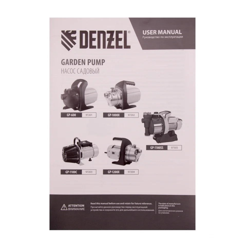 Садовый поверхностный насос GP1100SS, 1100 Вт, 4000 л/ч, подъем 45 м, пластик Denzel 97305