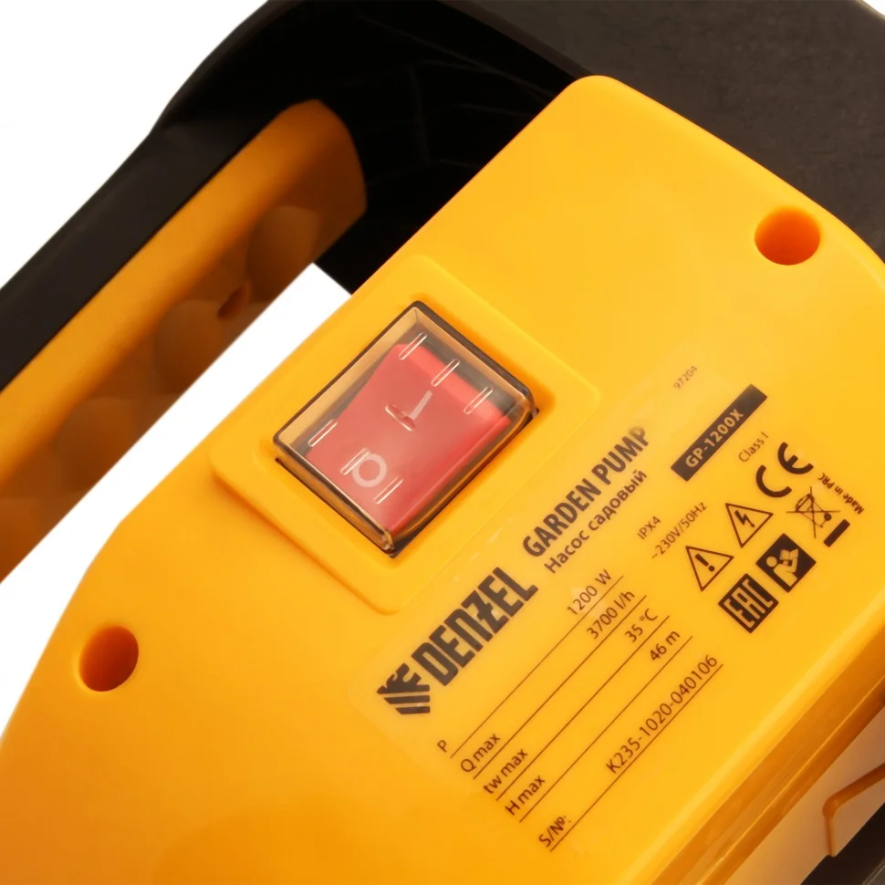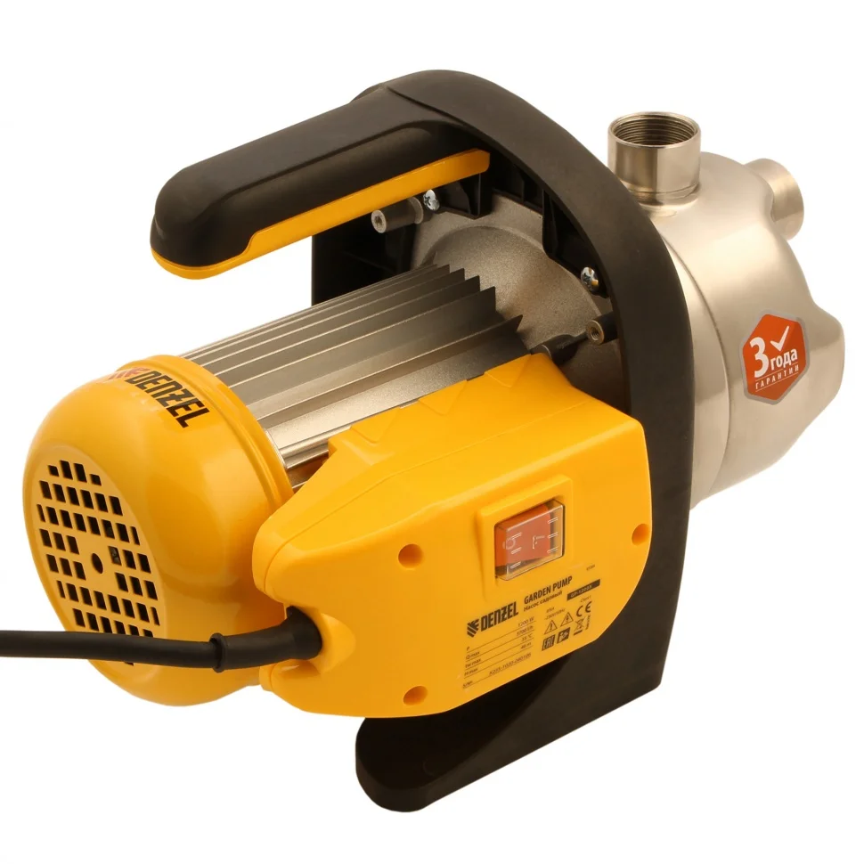 Садовый поверхностный насос Denzel GP1200X 97204 с корпусом насосной части из «нержавейки», мощностью 1200 Вт и производительностью 3700 л/ч, способен забирать чистую воду с глубины до 8 м из колодцев, емкостей и водоемов и подавать ее на высоту до 46 м. Обеспечивает стабильный напор и используется для организации системы полива и водоснабжения на даче. Производительности хватает для одновременного снабжения нескольких водоразборных точек.ПреимуществаЗащита от перегрева — термодатчик автоматически отключает работу при превышении допустимой температуры, что исключает выход двигателя из строя.Надежность — корпус насосной части изготовлен из нержавеющей стали, торцевое уплотнение — из карбида кремния, а вал — из стали.Безопасное использование — токопроводящие части имеют двойную изоляцию.Устойчивость — благодаря широким опорам насос не опрокидывается и работает корректно.Комфортное перемещение по участку — насос весом 8,4 кг снабжен удобной ручкой.Высокое качество — производитель предоставляет расширенную 3-летнюю гарантию на заводской брак.