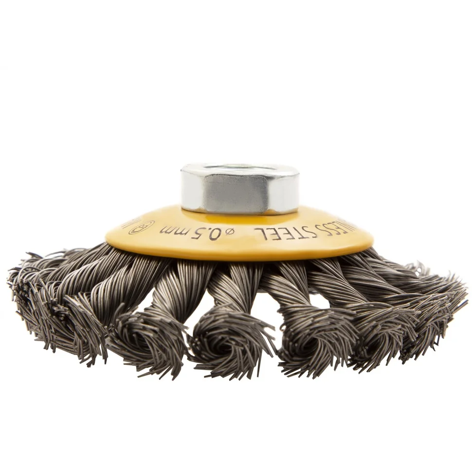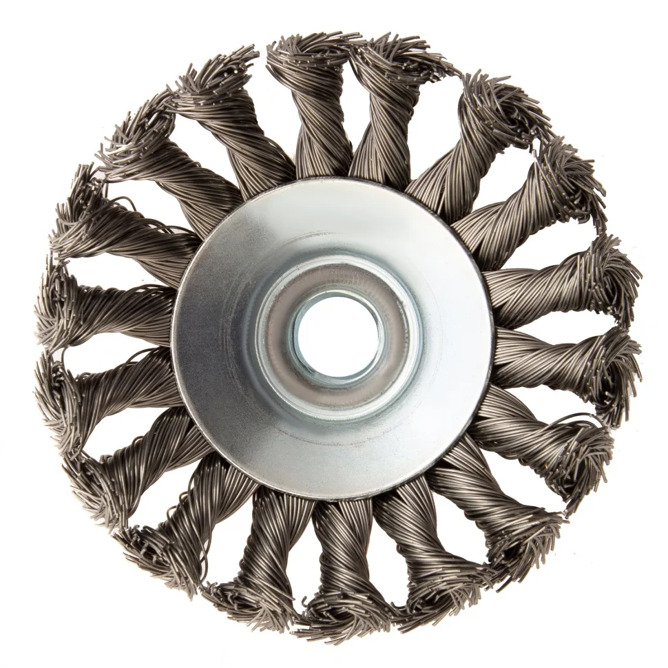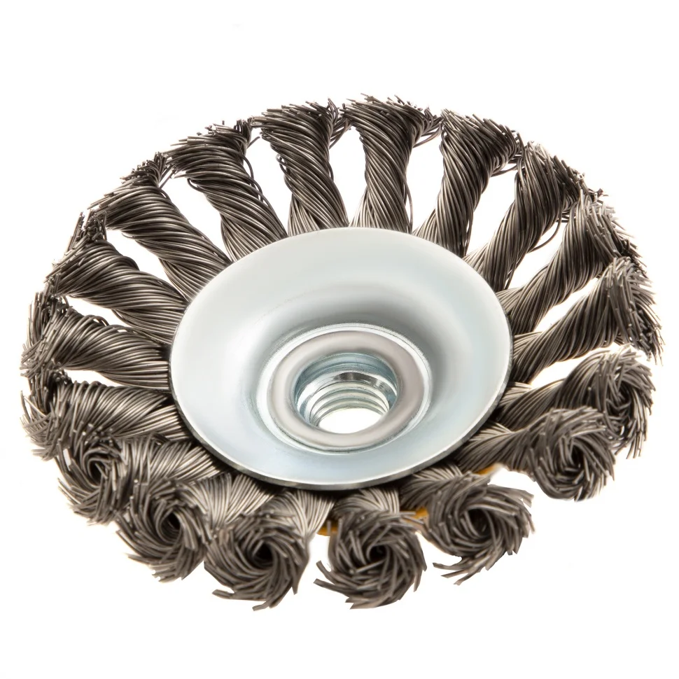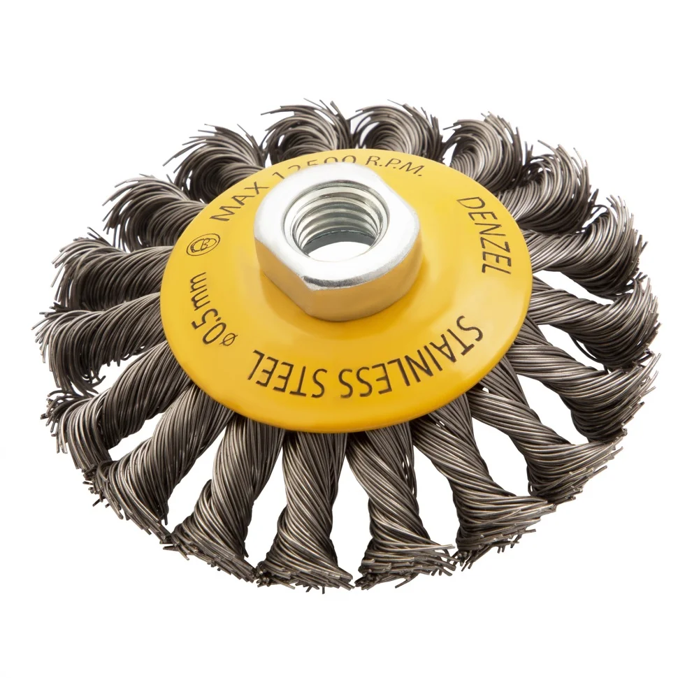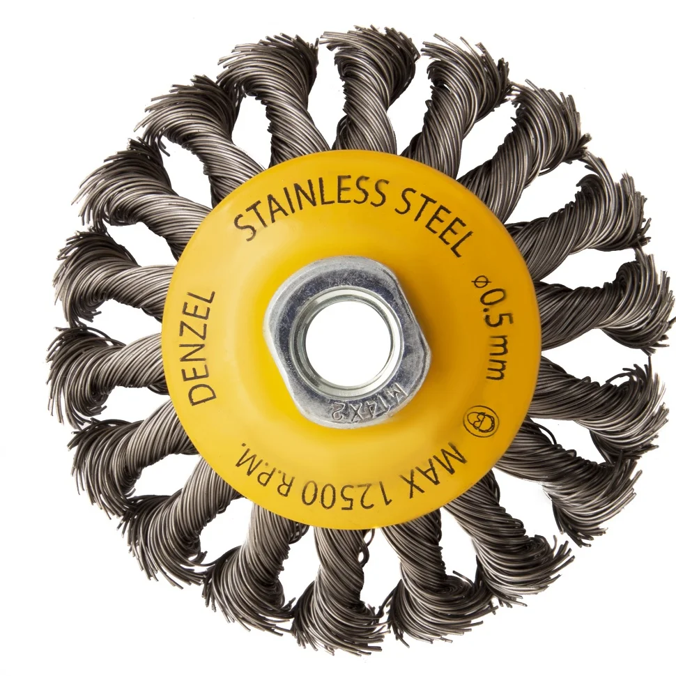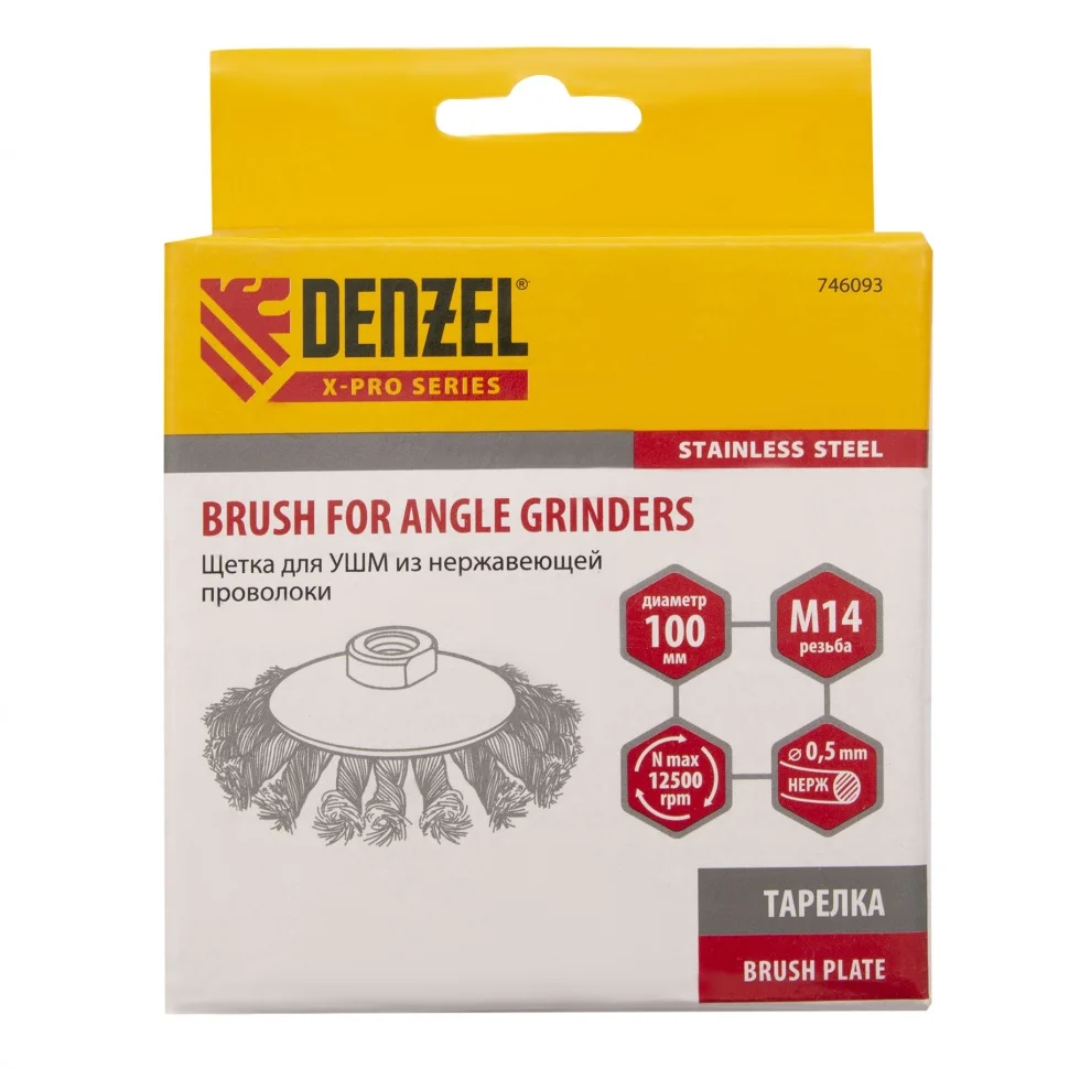 Щетка для УШМ Denzel «Тарелка» 746093, 100 мм, М14, с щетиной из крученой нержавеющей проволоки 0,5 мм, предназначена для снятия толстого слоя краски, лака, ржавчины, для удаления заусенцев и окалины, зачистки сварных швов. Щеткой обрабатывают твердые, преимущественно металлические поверхности, в том числе из нержавеющей стали. Она удобна для очистки как плоских изделий, так и внутренних углов, пазов, изгибов. Щетка совместима с углошлифовальными машинами, поддерживающими работу на скорости до 12500 об/мин. Во время работы необходимо использовать средства индивидуальной защиты. Щетка пригодится во время строительства, на производстве, а также будет полезна в быту.ПреимуществаЩетина изготовлена из нержавеющей стали AISI 201, поэтому ее частицы не вызывают микрокоррозии обрабатываемой поверхности.Проволока имеет витую форму, что обеспечивает высокую деформационную стойкость щетины.Щетина из нержавейки и покрытый эмалью корпус не подвержены коррозии, поэтому насадку можно использовать в условиях повышенной влажности.Для крепления на вал УШМ предусмотрена гайка М14, что позволяет быстро устанавливать и заменять оснастку.Корпус и гайка усилены, поэтому щетка устойчива к повышенным нагрузкам.Щетка изготовлена под строгим технологическим контролем, что гарантирует ее высокое качество.