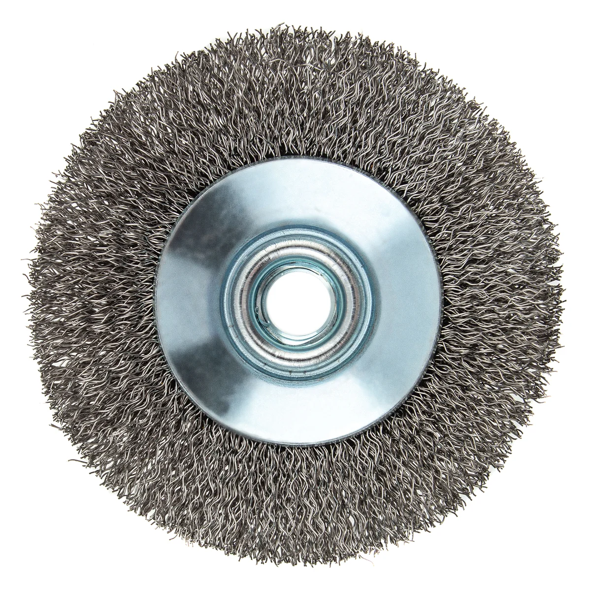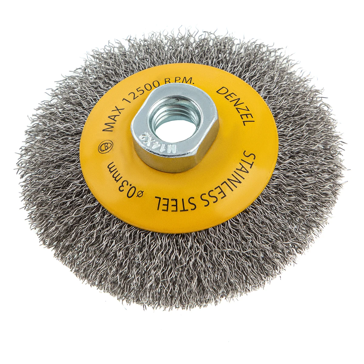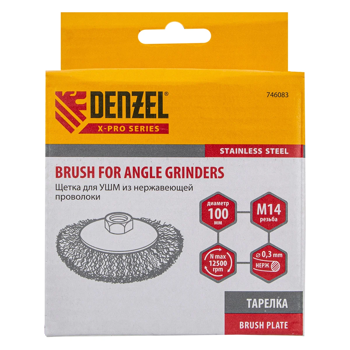 Щетка для УШМ Denzel «Тарелка» 746083, М14, 100 мм, с щетиной из витой нержавеющей проволоки диаметром 0,3 мм, используется для щадящей очистки металлических, деревянных или пластиковых поверхностей от незначительных загрязнений и ржавчины, а также остатков лакокрасочных материалов. Поможет придать поверхности шероховатость или матовость. Насадка является универсальной и подходит для обработки как плоскостей, так и углов, а также других труднодоступных участков. Оптимальна для обработки изделий из нержавейки. Насадка устанавливается на вал углошлифовальной машины (УШМ), рекомендуемая максимальная скорость составляет 12500 об/мин. Во время работы следует соблюдать технику безопасности и использовать средства индивидуальной защиты. Щетку применяют в строительстве, на производстве, а также в домашнем хозяйстве.ПреимуществаЩетина изготовлена из нержавеющей стали AISI 201, поэтому ее частицы не вызывают микрокоррозии обрабатываемой поверхности.Проволока имеет витую форму, что обеспечивает высокую деформационную стойкость щетины.Щетина из нержавейки и покрытый эмалью корпус не подвержены коррозии, поэтому насадку можно использовать в условиях повышенной влажности.Для крепления на вал УШМ предусмотрена гайка М14, что позволяет быстро устанавливать и заменять оснастку.Корпус и гайка усилены, поэтому щетка устойчива к повышенным нагрузкам.Щетка изготовлена под строгим технологическим контролем, что гарантирует ее высокое качество.