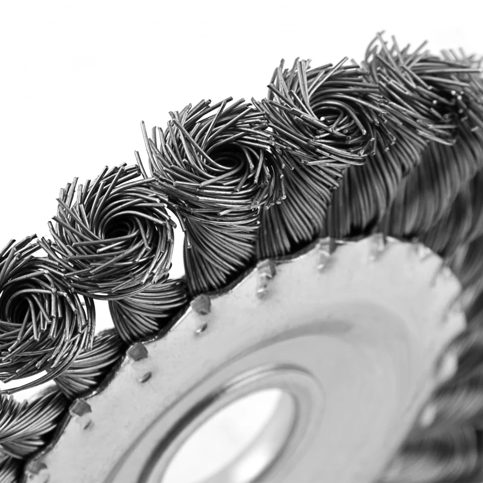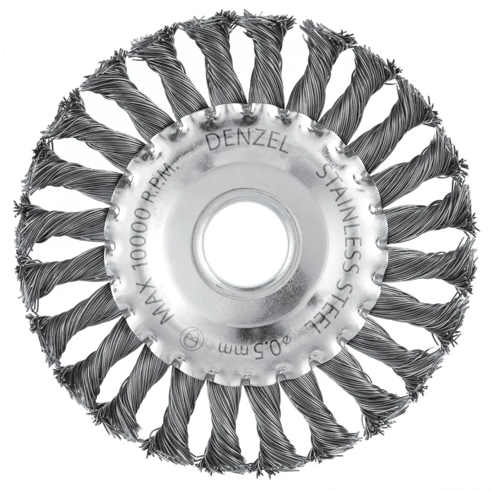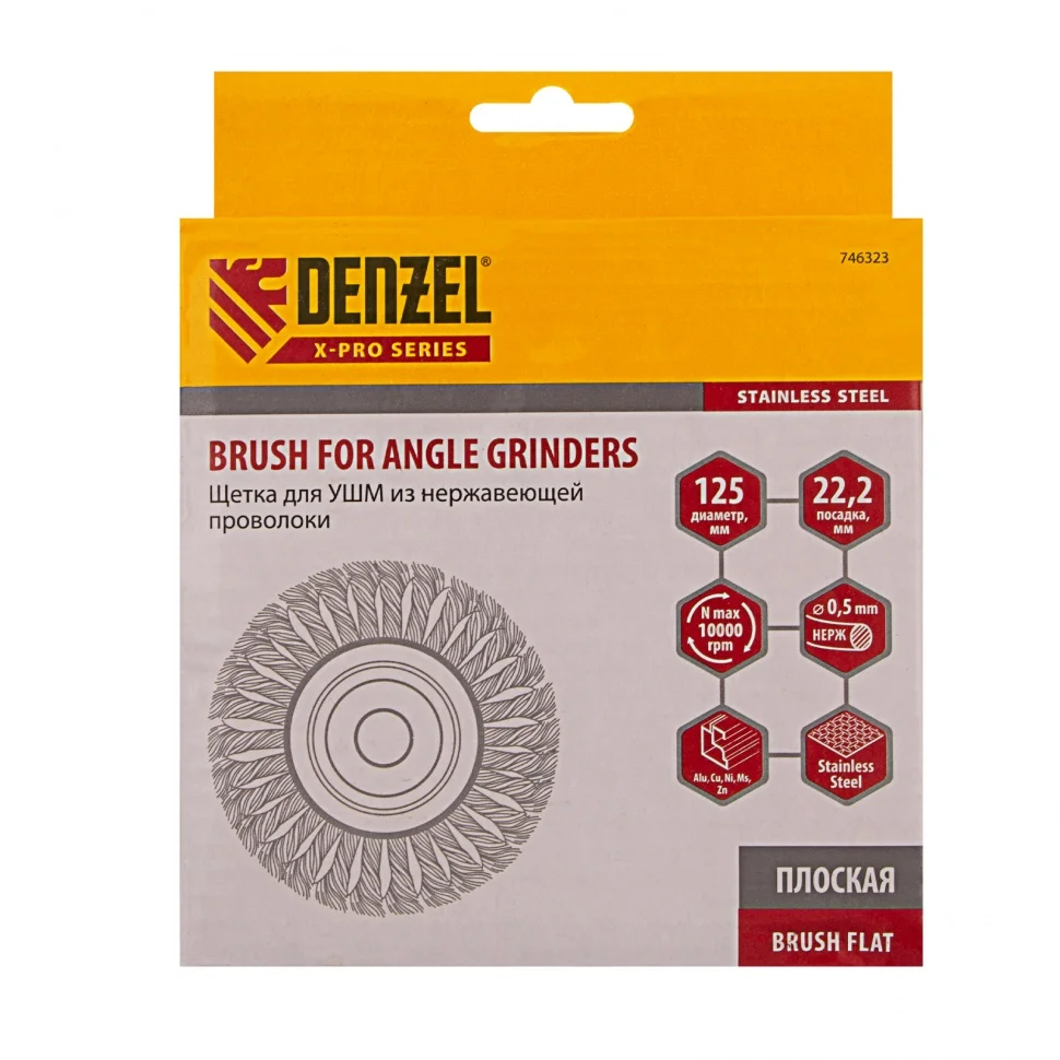 Плоская щетка для УШМ Denzel 746323 диаметром 125 мм, с посадкой 22,2 мм, с щетиной из крученой нержавеющей проволоки 0,5 мм, предназначена для снятия толстого верхнего слоя с металлических, деревянных, бетонных поверхностей. Удаляет загрязнения, ржавчину, старые лакокрасочные покрытия, заусенцы, окалину с ровных поверхностей и в труднодоступных местах. Оптимальна для обработки изделий из нержавеющей стали, а также зачистки сварных швов. Щетку устанавливают на фланец углошлифовальной машины, что удобно для выполнения большого объема работ, не требующих частой смены насадок. Рекомендуемая максимальная скорость вращения 10000 об/мин. Во время работы обязательно использование средств индивидуальной защиты. Щетка будет полезна на строительной площадке, производственном предприятии, а также пригодится в быту.ПреимуществаЩетина из проволоки толщиной 0,5 мм, скрученной в пучки, выдерживает повышенные нагрузки.Оцинкованный корпус и щетина из нержавейки не боятся коррозии, поэтому щетку можно использовать в районах с высокой влажностью.Частицы проволоки из нержавеющей стали AISI 201 не вызывают коррозии обработанной поверхности.Усиленный корпус обеспечивает щетке повышенную устойчивость к деформациям.Технологический контроль на всех этапах производства гарантирует высокое качество оснастки.