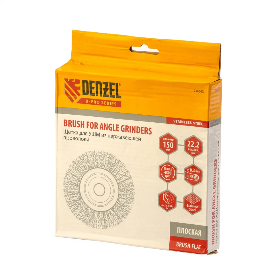 Плоская щетка для УШМ Denzel 746643 диаметром 150 мм, с щетиной из витой нержавеющей проволоки 0,3 мм, с посадкой 22,2 мм, постепенно снимает тонкий слой материала, поэтому ее используют для щадящей обработки металлических, деревянных, пластиковых поверхностей, а также изделий из нержавеющей стали. Щетка удаляет ржавчину, загрязнения, остатки лакокрасочных покрытий из труднодоступных мест, пазов и углов. Оснастка с посадкой 22,2 мм устанавливается на фланец углошлифовальной машины, что удобно для длительной работы без смены насадок. Рекомендуемая максимальная скорость вращения составляет 4500 об/мин. Во время работы следует использовать средства индивидуальной защиты. Щетку применяют в строительстве, машиностроении, а также в быту.ПреимуществаЩетина хорошо держит форму благодаря витой проволоке, устойчивой к деформациям при нагрузках.Частицы щетины, оставшиеся на обработанной поверхности, не ржавеют, поскольку проволока изготовлена из нержавеющей стали AISI 201.Щетка устойчива к коррозии даже в условиях повышенной влажности, т.к. ее корпус оцинкован, а щетина выполнена из нержавейки.Оснастка обладает повышенной прочностью благодаря усиленному корпусу.Высокое качество щетки подтверждено производителем, осуществляющим строгий технологический контроль на всех этапах производства.