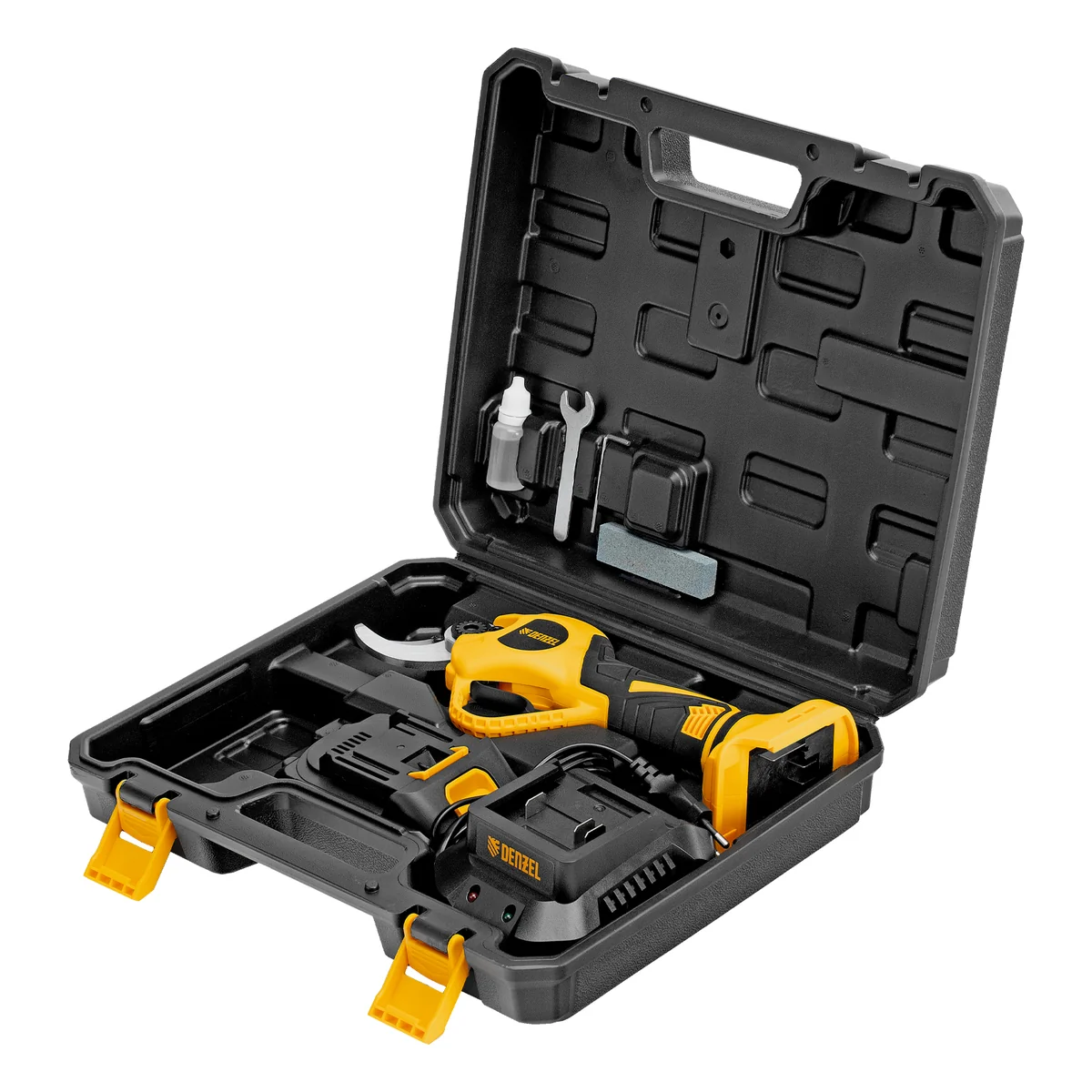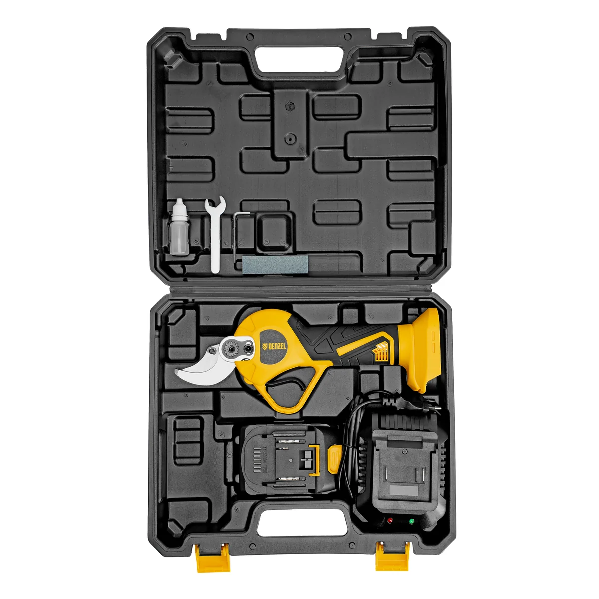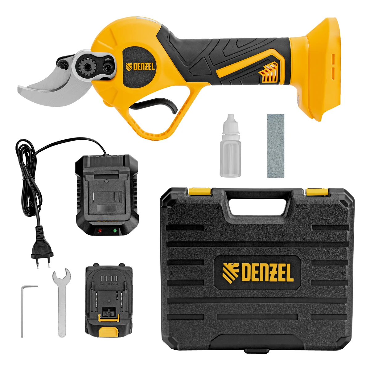 - Расширенная комплектация — секатор поставляется с аккумулятором, зарядным устройством, гаечным и шестигранным ключами, масленкой и точильным камнем.