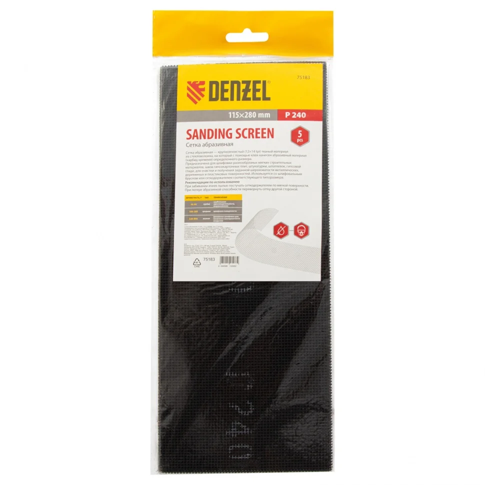 Абразивная сетка Denzel 75183, 115 х 280 мм, с зернистостью P 240, 5 шт. в упаковке, применяется для финишной обработки и придания гладкости зашпаклеванным поверхностям, а также твердой древесине и металлу. Она бережно снимает тонкий слой материала и лакокрасочного покрытия, удаляет ржавчину и заусенцы, сглаживает неровности. Абразивный слой обладает высоким ресурсом, т.к. зерна карбида кремния стачиваются медленно. Сетку устанавливают на ручные шлифовальные приспособления — бруски и сеткодержатели соответствующего типоразмера.ПреимуществаОснова сетки из прочного стекловолокна устойчива к разрыву.Полотно с сетчатой структурой не забивается отходами шлифования.Абразивное покрытие нанесено с обеих сторон, так что при необходимости сетку просто переворачивают и продолжают работу.Загрязнившееся полотно можно очистить легким постукиванием, что экономит время мастера.Упаковки из 5 штук хватит надолго.