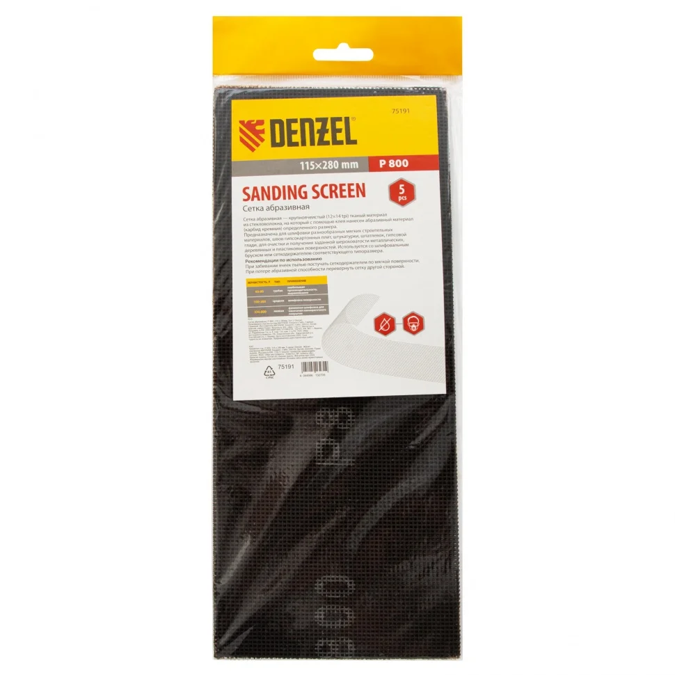 Абразивная сетка Denzel 75191, 115 х 280 мм, с зернистостью P 800, 5 шт. в упаковке, применяется для финишной обработки и придания гладкости зашпаклеванным поверхностям, а также твердой древесине и металлу. Она бережно снимает тонкий слой материала и лакокрасочного покрытия, удаляет ржавчину и заусенцы, сглаживает неровности. Абразивный слой обладает высоким ресурсом, т.к. зерна карбида кремния стачиваются медленно. Сетку устанавливают на ручные шлифовальные приспособления — бруски и сеткодержатели соответствующего типоразмера.ПреимуществаОснова сетки из прочного стекловолокна устойчива к разрыву.Полотно с сетчатой структурой не забивается отходами шлифования.Абразивное покрытие нанесено с обеих сторон, так что при необходимости сетку просто переворачивают и продолжают работу.Загрязнившееся полотно можно очистить легким постукиванием, что экономит время мастера.Упаковки из 5 штук хватит надолго.
