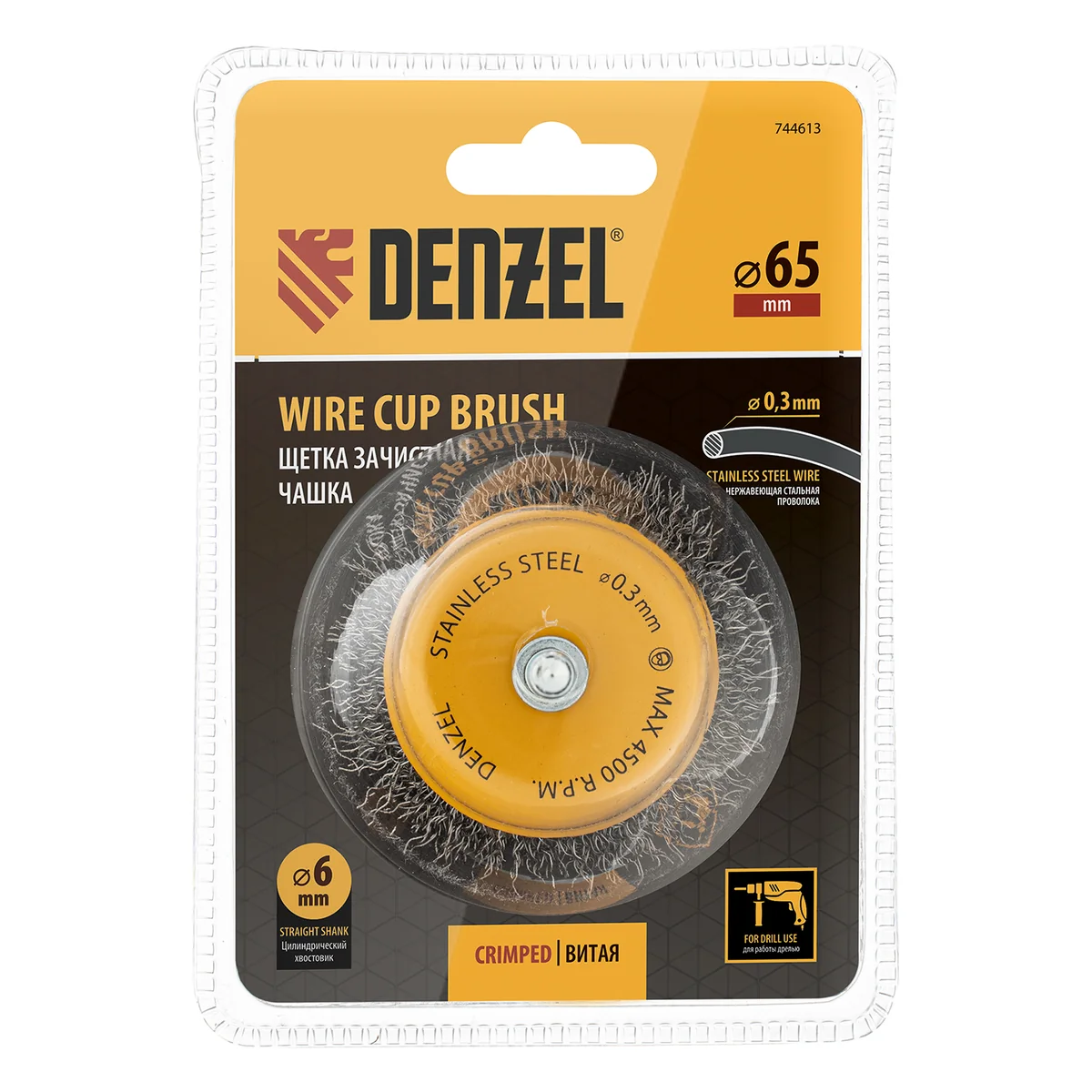 Щетка для дрели, 65 мм, Чашка, со шпилькой , нержавеющая витая проволока Denzel 744613