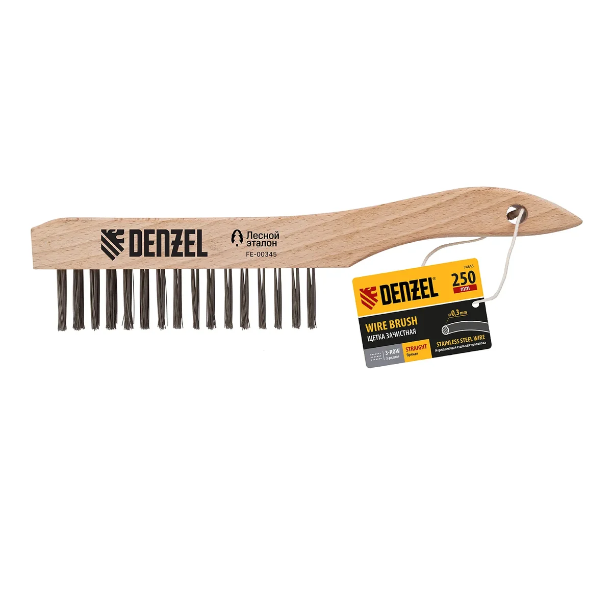 Зачистная 3-рядная щетка Denzel 74843 с прямой проволокой из нержавеющей стали и деревянной рукояткой — ручной инструмент для обработки деревянных, металлических и других поверхностей. Позволяет удалять загрязнения, ржавчину, остатки отделочных покрытий и т.д. Стальная щетина толщиной 0,3 мм с высокой абразивной способностью обеспечивает эффективное выполнение работ.