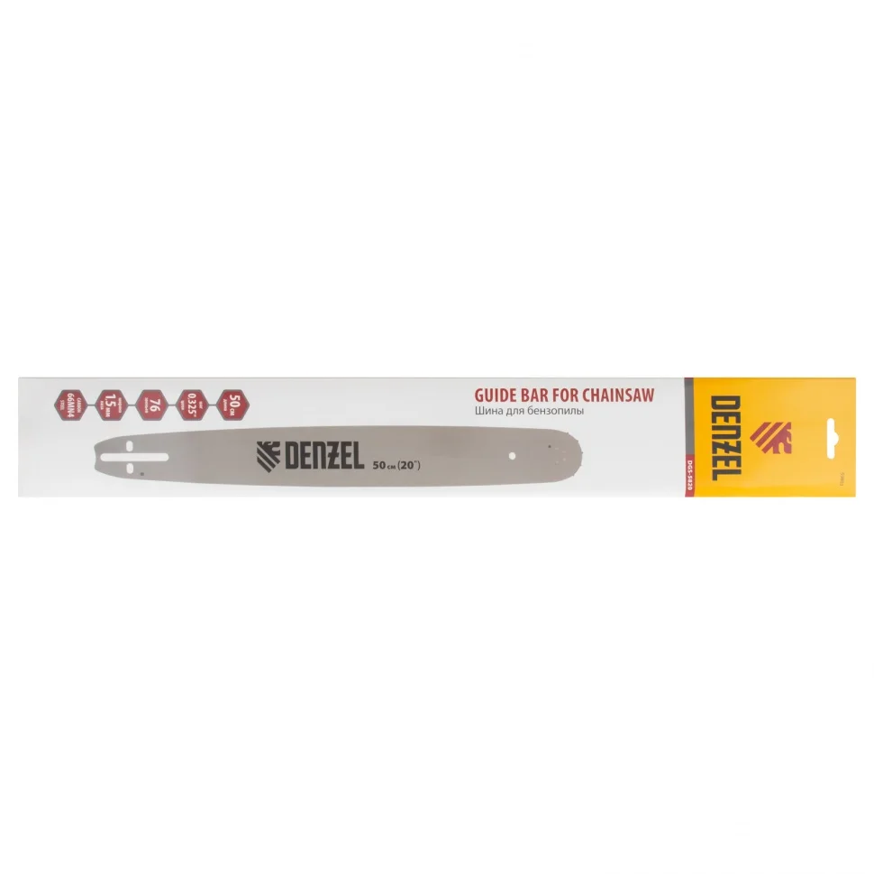 Шина Denzel предназначена для цепной бензиновой пилы Denzel DGS-5820 и выполнения таких задач, как: распиловка древесины, заготовка дров, валка деревьев, срезание лишних веток в саду, выполнение заказов в столярных мастерских, частное строительство. За счет длины 50 см идеально справляется с различными задачами.Преимущества:Шина сделана из немецкой конструкционной стали 66Mn4 с порошковым покрытием, что обеспечивает ей высокую прочность и медленный износ. Пользователю не придется часто менять пильную гарнитуру.На шину надевается цепь с 76 звеньями, поэтому она подходит для полупрофессионального применения и выдерживает интенсивные нагрузки.Ведомая звездочка отличается высоким рабочим ресурсом, что гарантирует непрерывную работу цепи и эффективный распил древесины.Пазы на хвостовике продуманы таким образом, чтобы шина крепилась к пиле прочно и не клонилась в стороны при работе.Через технологические каналы на хвостовике осуществляется своевременная подача смазочного масла к цепи, повышающего ее долговечность.