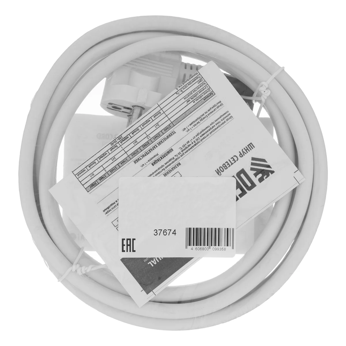 Белый сетевой шнур Denzel Energy Series 37674 с кабелем ПВС сечением 3 x 1,5 мм и длиной 3 м, с неразборной вилкой, предназначен для подключения к сети электроприборов мощностью до 3680 Вт. Для смотанного кабеля максимальная мощность потребителя составляет 1840 Вт. Шнур можно использовать для самостоятельного подключения прибора или замены вышедшего из строя провода. Сделано в России.