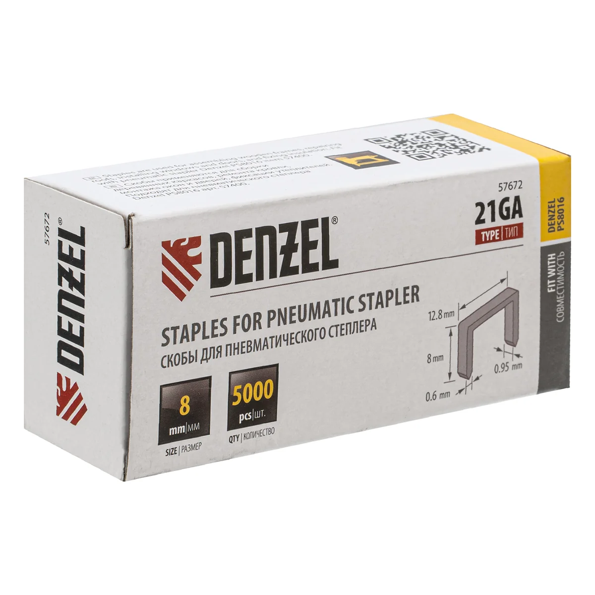 Скобы 21GA Denzel 57672 шириной 12,8 мм, 5000 шт. в упаковке, предназначены для пневматического степлера, совместимого с крепежом размера 8 х 0,95 х 0,6 мм. Используются для крепления листовых материалов к деревянному основанию, подходят для обивки мебели, укладки напольного покрытия, фиксации утеплителя.ПреимуществаПрочность и долговечность — скобы изготовлены из стали, цинковое покрытие защищает их от коррозии.Высокое качество проводимых работ — скобы образуют надежное и долговечное крепление.Продуманная комплектация — упаковки из 5000 шт. хватит для выполнения большого объема работ.