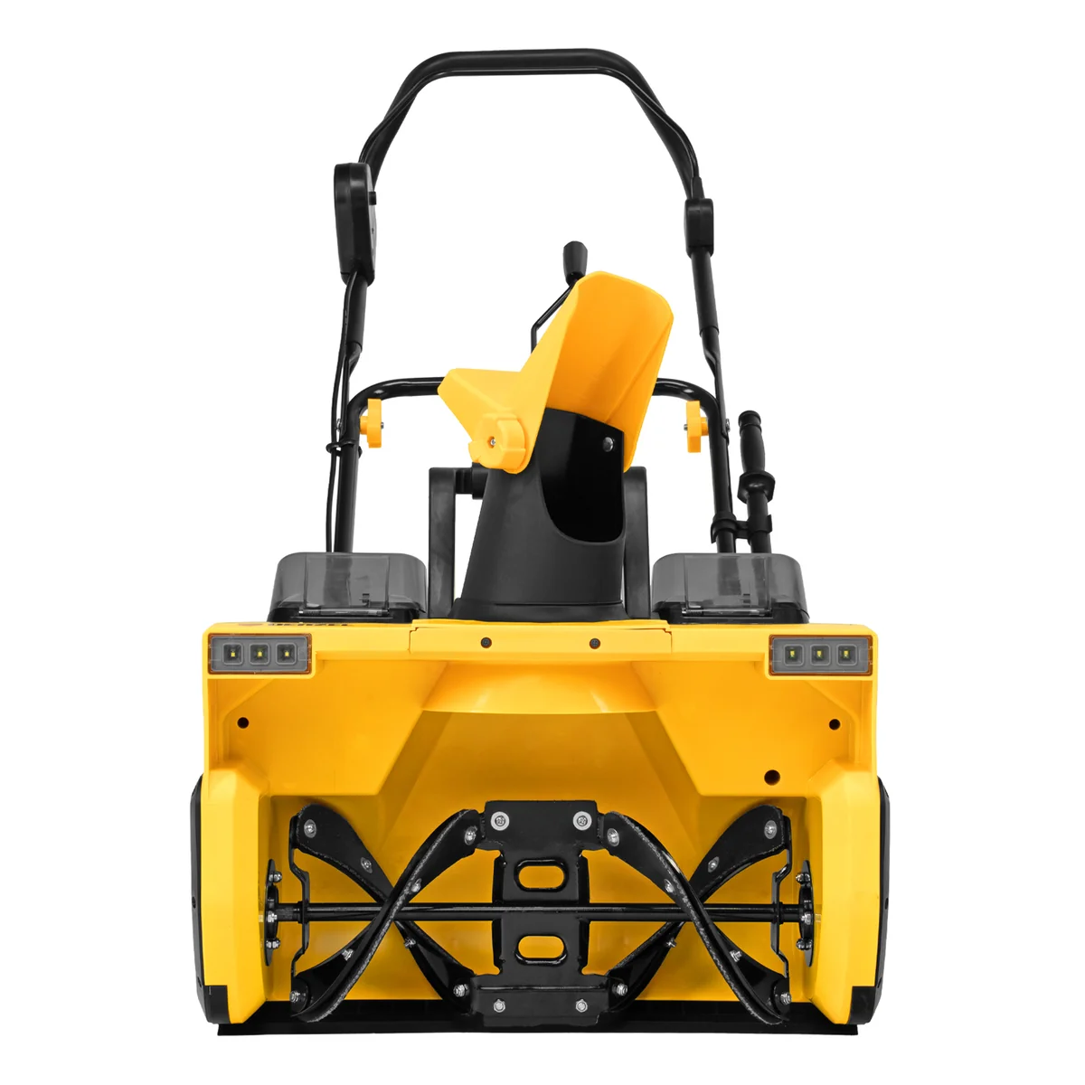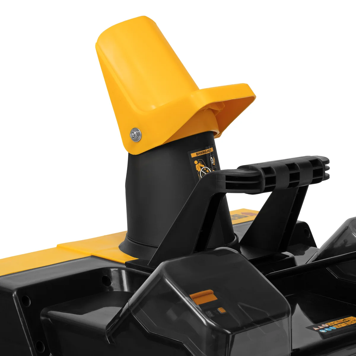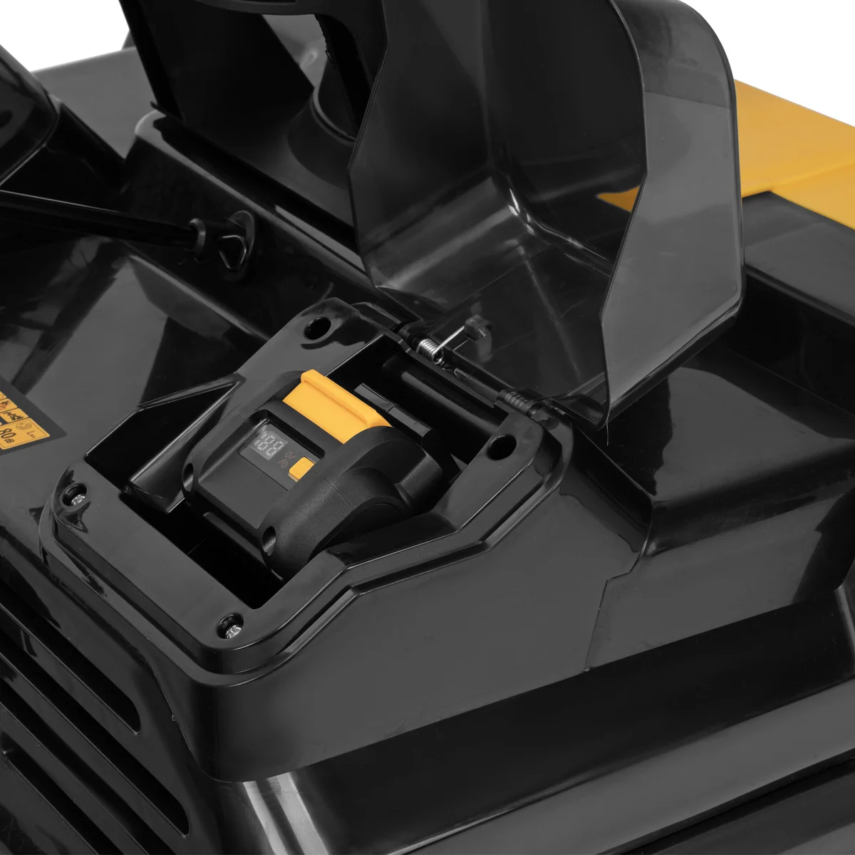 - Полная комплектация — снегоуборщик поставляется с 2 аккумуляторами, зарядным устройством и скребком для очистки желоба.