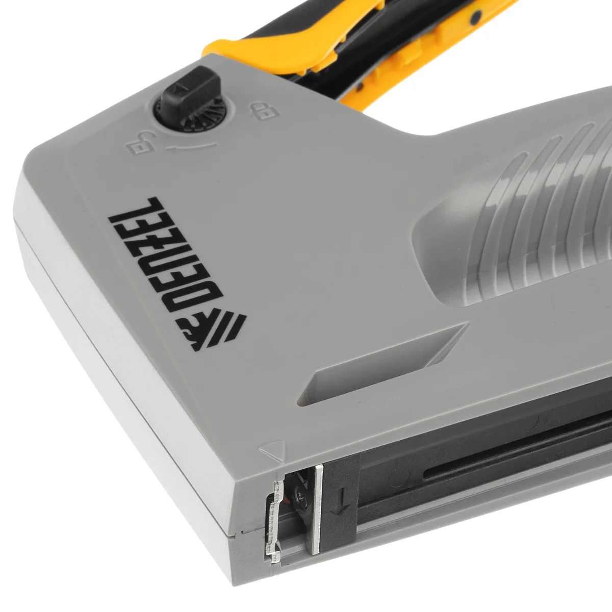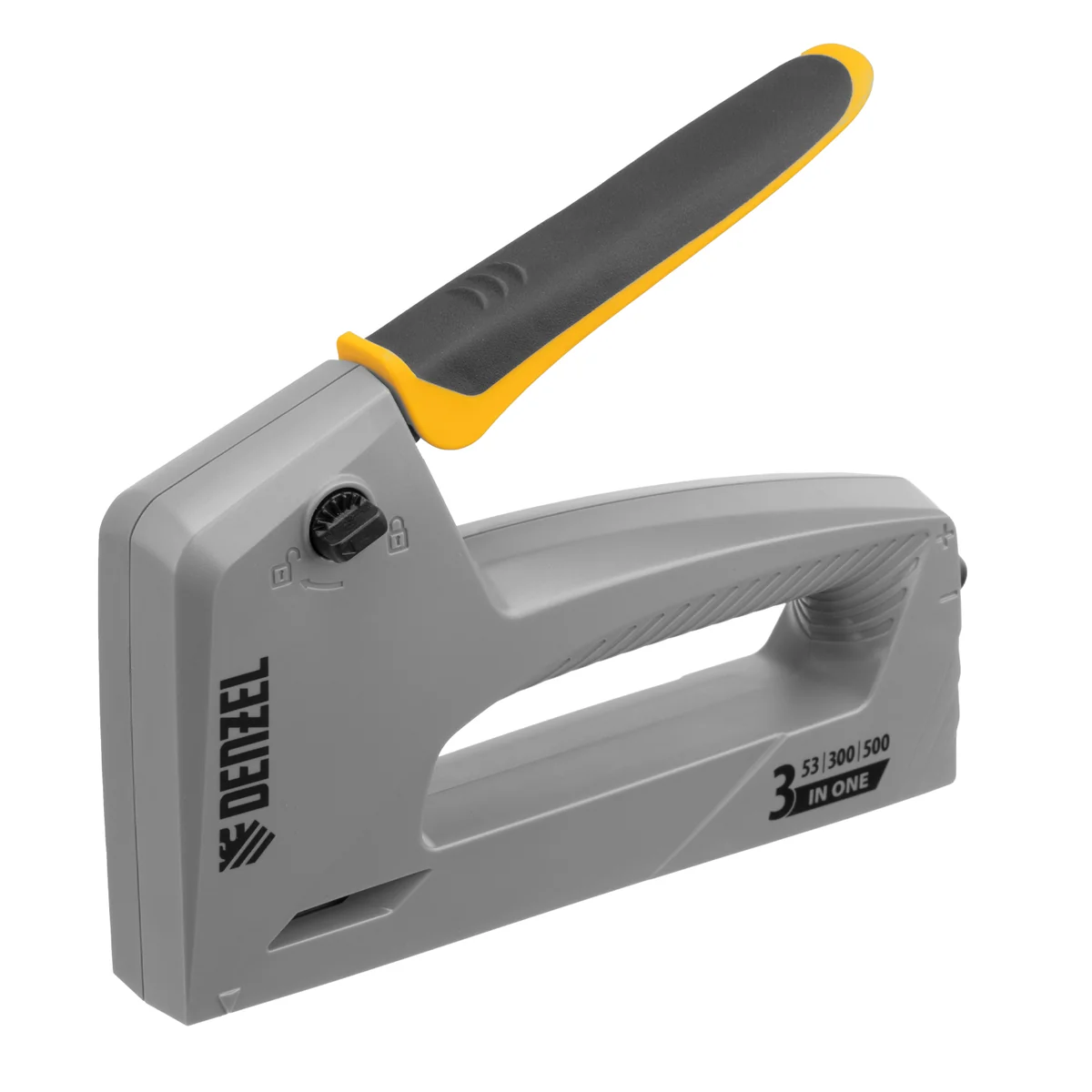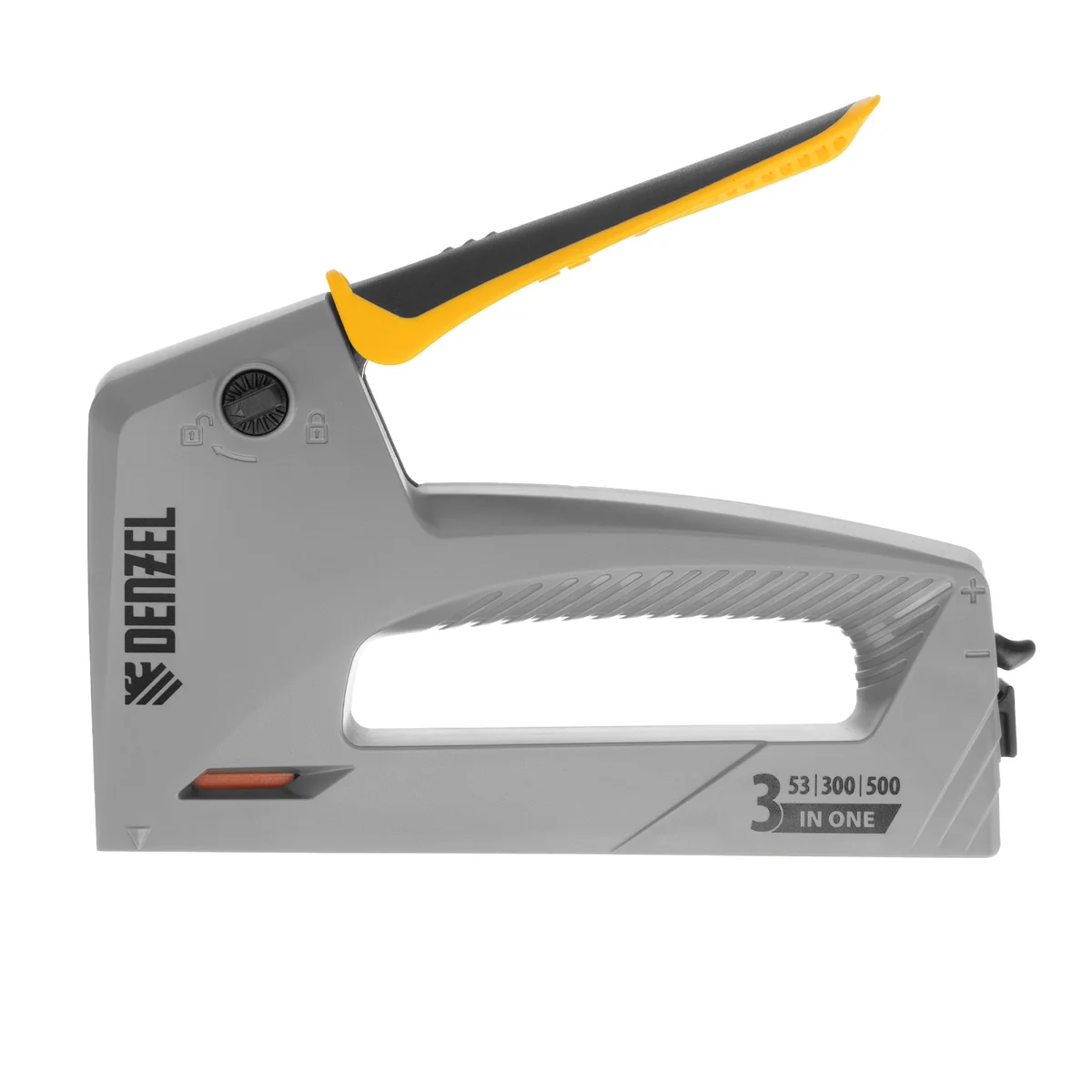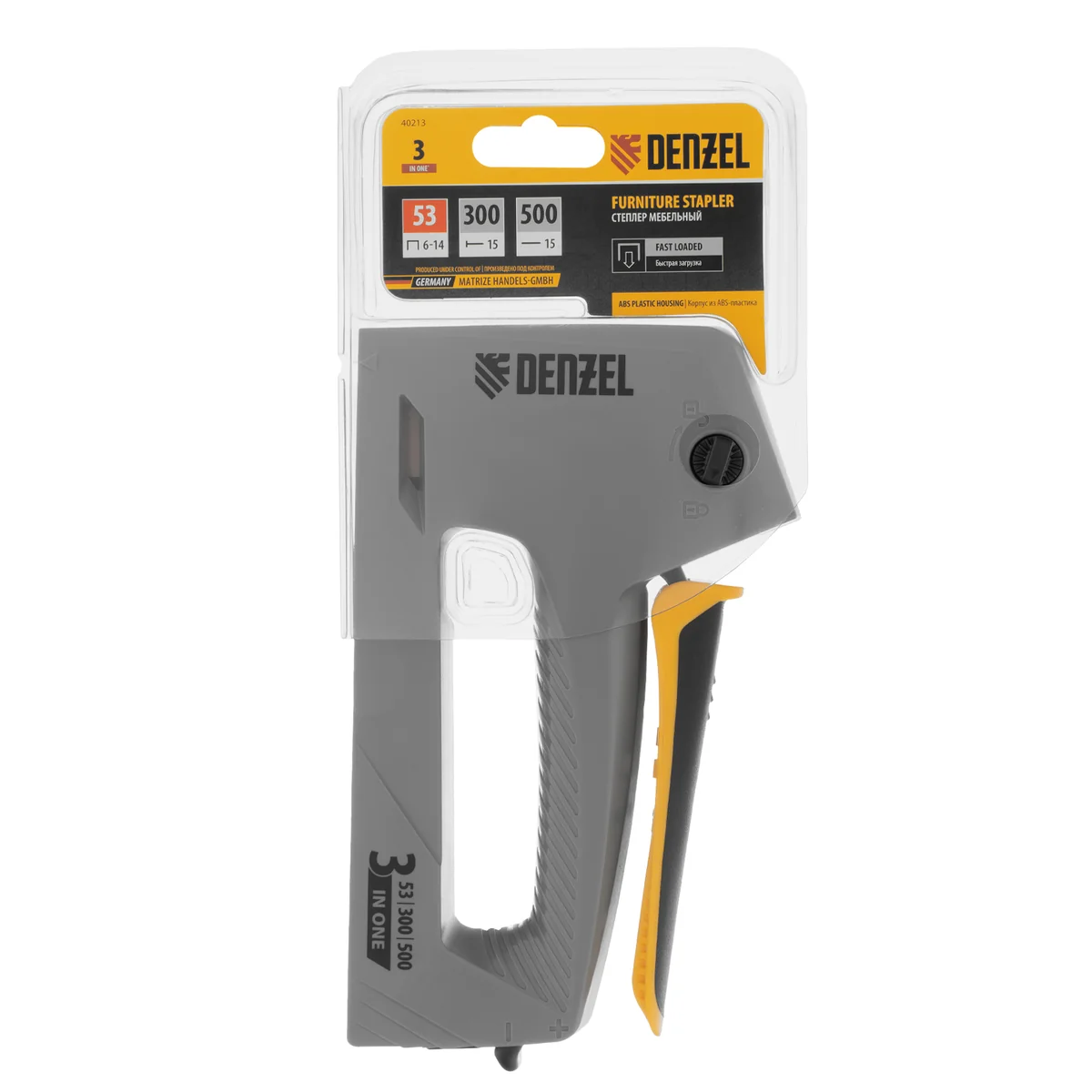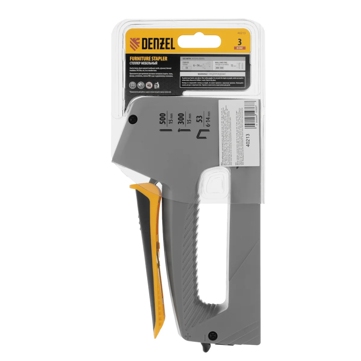 Мебельный степлер Denzel 40213 в пластиковом корпусе работает со скобами типа 53 размером 6-14 мм, а также гвоздями 300 и штифтами 500 длиной 15 мм. Используется для скрепления листовых материалов: фанеры, ДВП, ДСП, оргалита, а также для фиксации пленки и теплоизоляционного материала на деревянном основании. Эффективный ударный механизм позволяет на 30% снизить нагрузку на руку. Инструмент пригодится для обивки мебели, укладки напольных покрытий, выполнения ремонтных и багетных работ.Преимущества Надежность — пластиковый корпус устойчив к мелким механическим повреждениям. Аккуратная работа — 2-позиционная регулировка силы удара позволяет закреплять тонкие материалы без риска их разрыва. Легкая подготовка к работе — благодаря механизму быстрой загрузки установка скоб занимает несколько секунд. Контроль количества скоб — в корпусе имеется удобное смотровое окошко. Комфортное использование — двухкомпонентная рукоятка не выскальзывает из ладони. Безопасное хранение и транспортировка — поворотный блокиратор надежно фиксирует рукоятку в нерабочем положении.