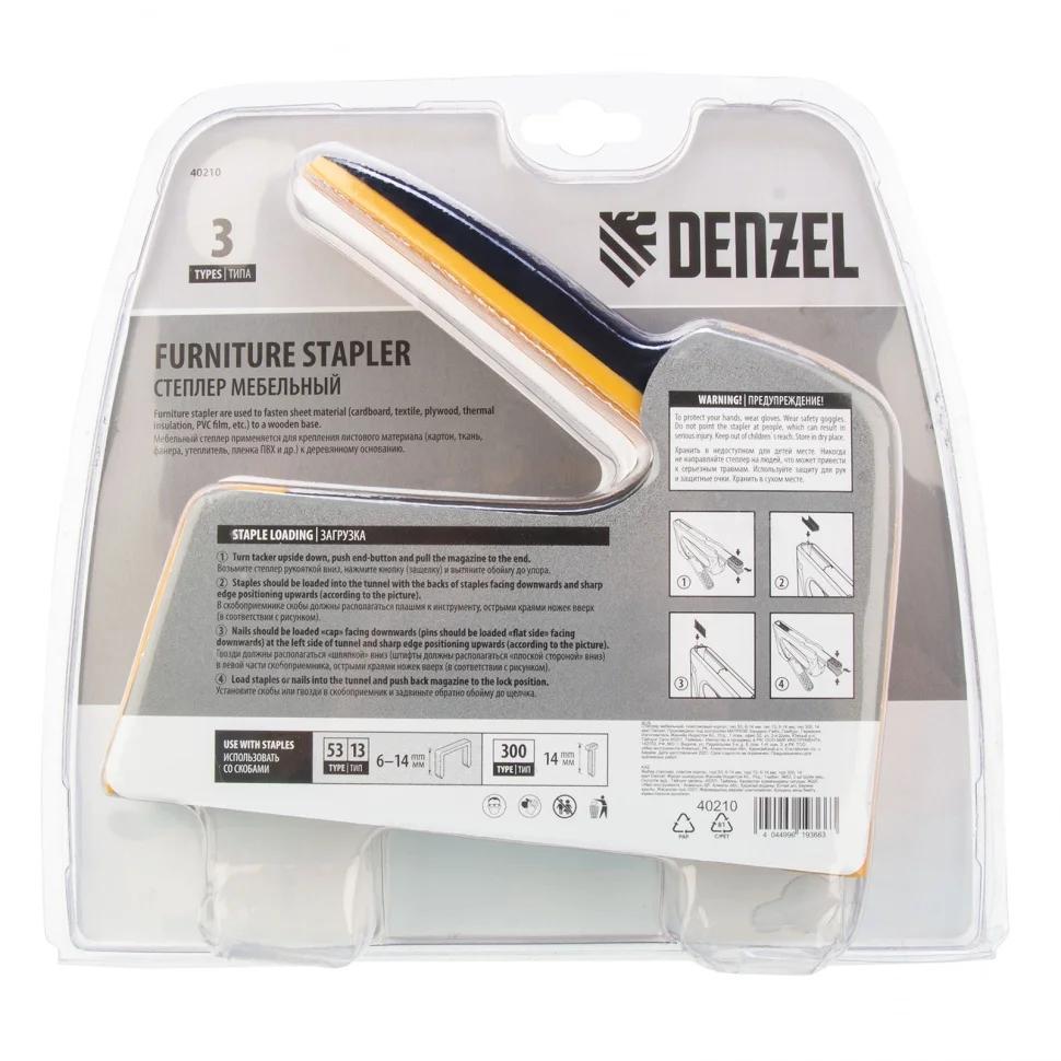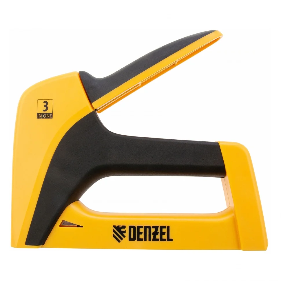 Мебельный степлер Denzel 40210 в пластиковом корпусе совместим со скобами типа 53, 6-14 мм, типа 13, 6-14 мм и типа 300, 14 мм, и позволяет быстро скрепить с деревянным основанием листовой материал — фанеру, ткань, пленку ПВХ, утеплитель, картон. Корпус изготовлен методом литья из ударопрочного ABS-пластика и устойчив к механическим повреждениям. Инструмент весит 400 г и удобен для длительного использования. Будет полезен при сборке и обивке мебели, укладке напольных покрытий, а также во время ремонтных и багетных работ.ПреимуществаЭргономичная двухкомпонентная рукоятка имеет нескользящую поверхность, поэтому работать степлером комфортно.В корпусе имеется прорезь для контроля наличия скоб в скобоприемнике.Функция быстрой загрузки скоб экономит время мастера.
