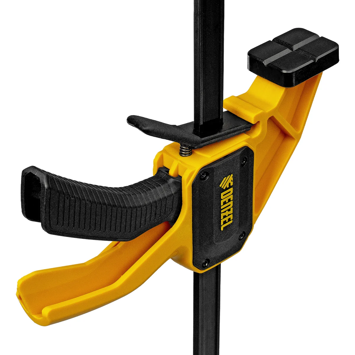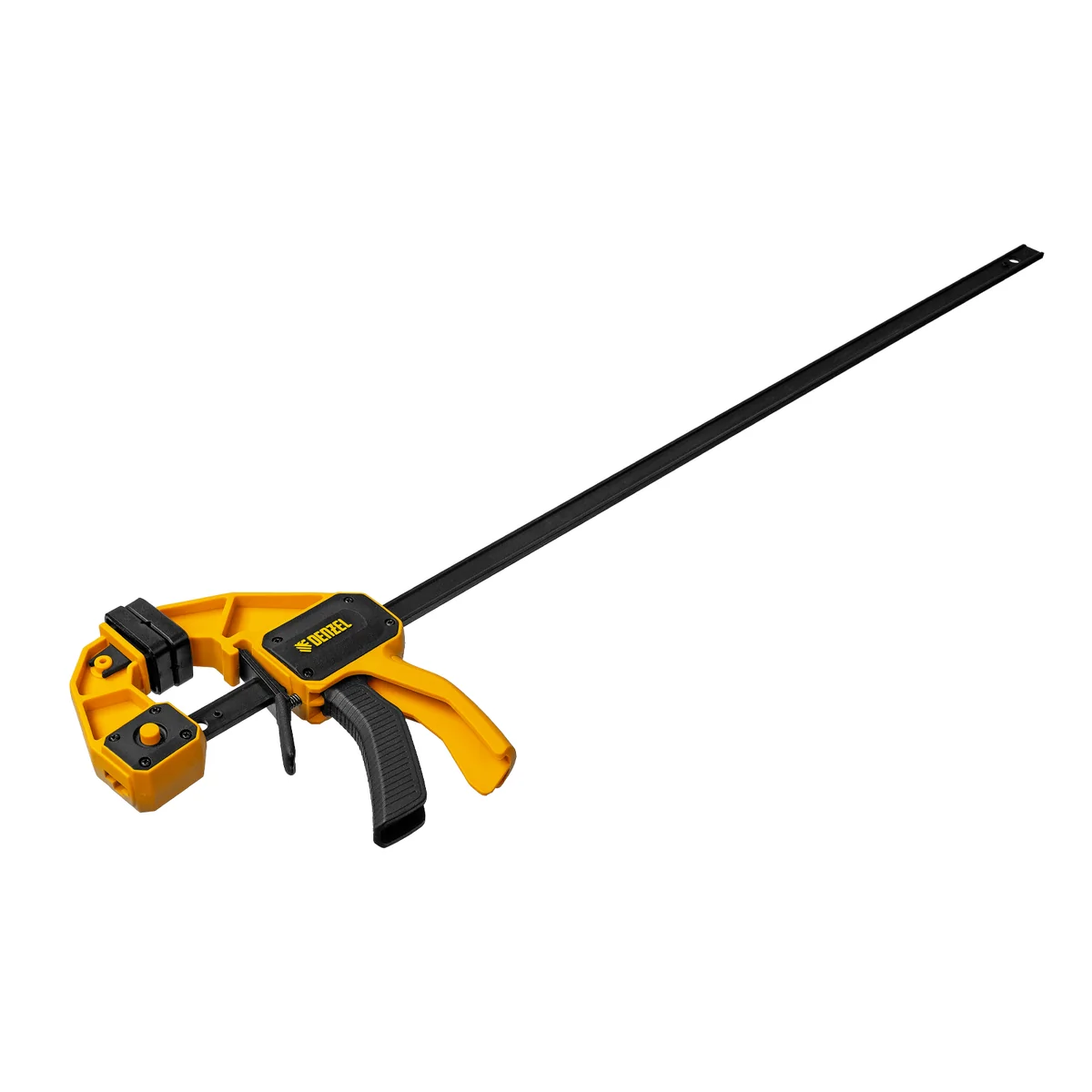 - Комфортное использование — струбцина весит всего 764 г, обрезиненная кнопка фиксации обеспечивает удобный захват.