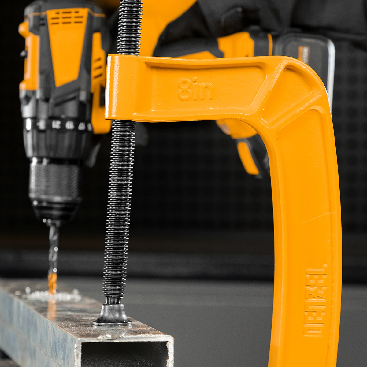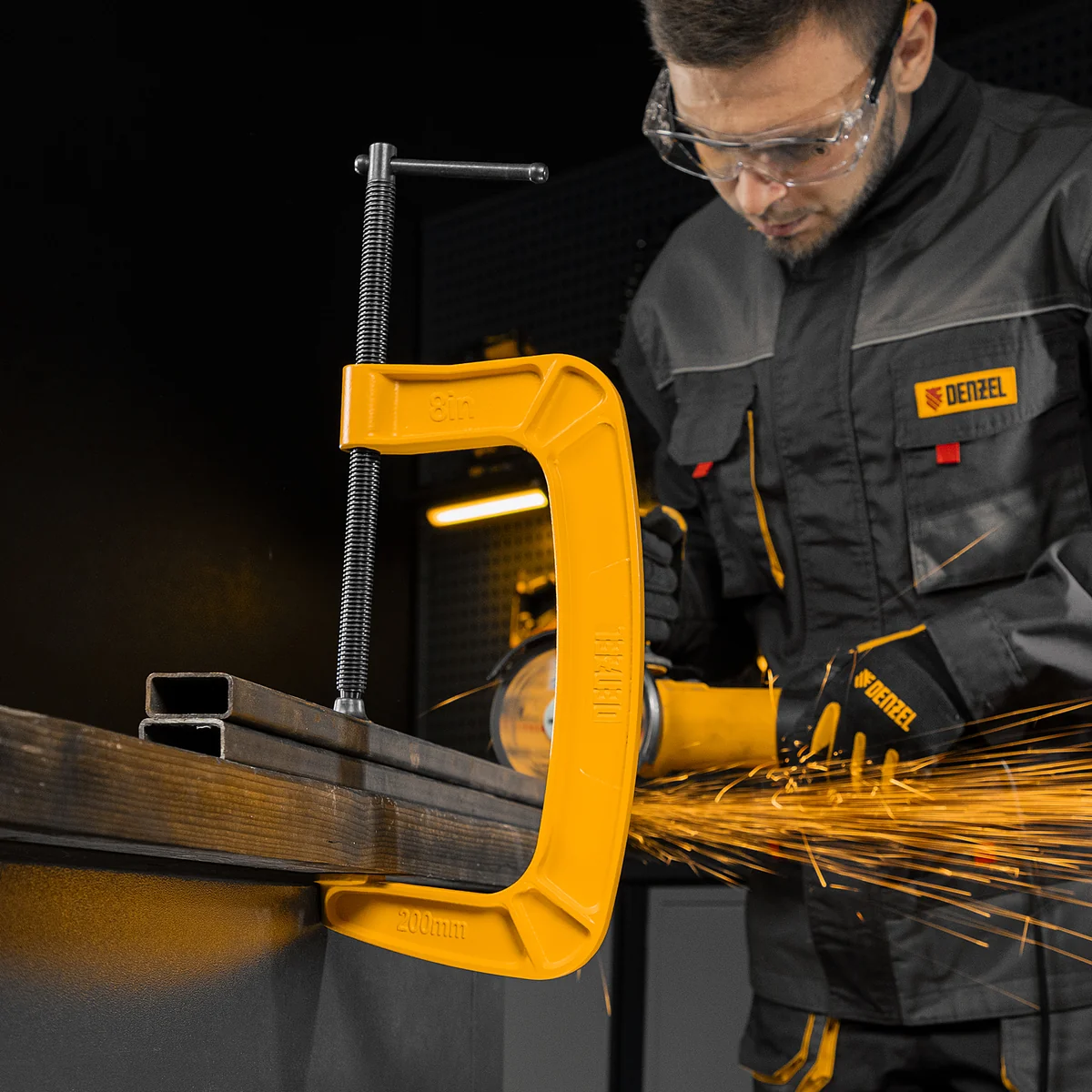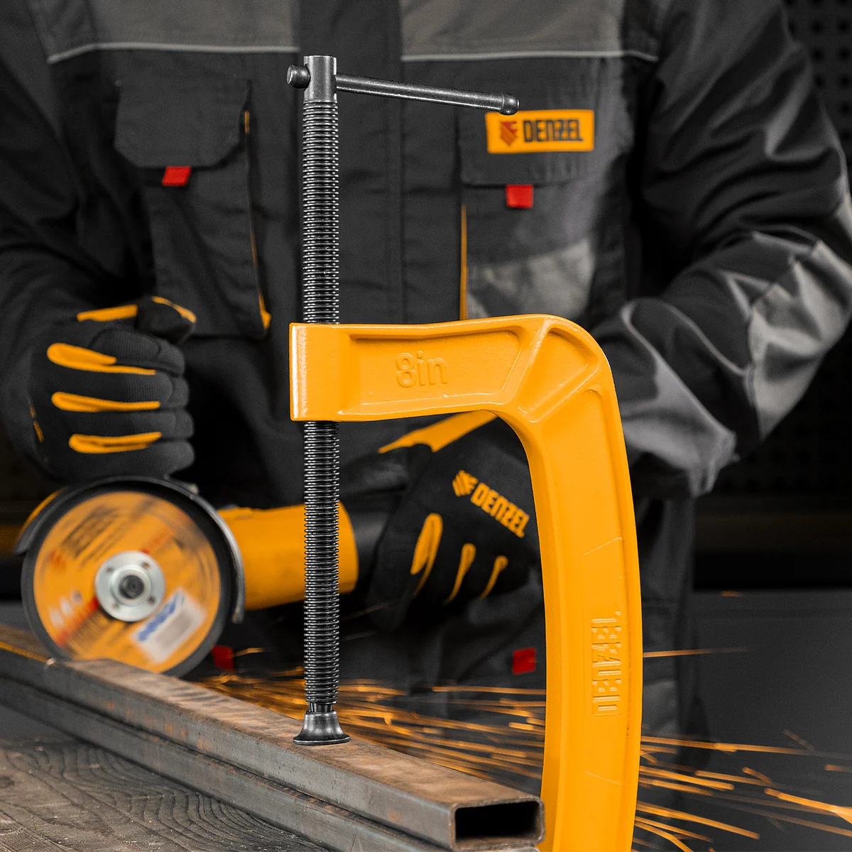 G-образная струбцина Denzel 20646 с максимальной шириной зажима 200 мм используется для фиксации заготовок или закрепления их на верстаке, станке или между собой. Позволяет склеивать детали, а также сверлить их, шлифовать, опиливать и проводить другие работы. Может использоваться во время выполнения сварочных работ. Винт с трапециевидной резьбой обеспечивает надежную фиксацию предметов. Струбцина применяется в слесарном и столярном деле, будет полезна также домашнем хозяйстве.