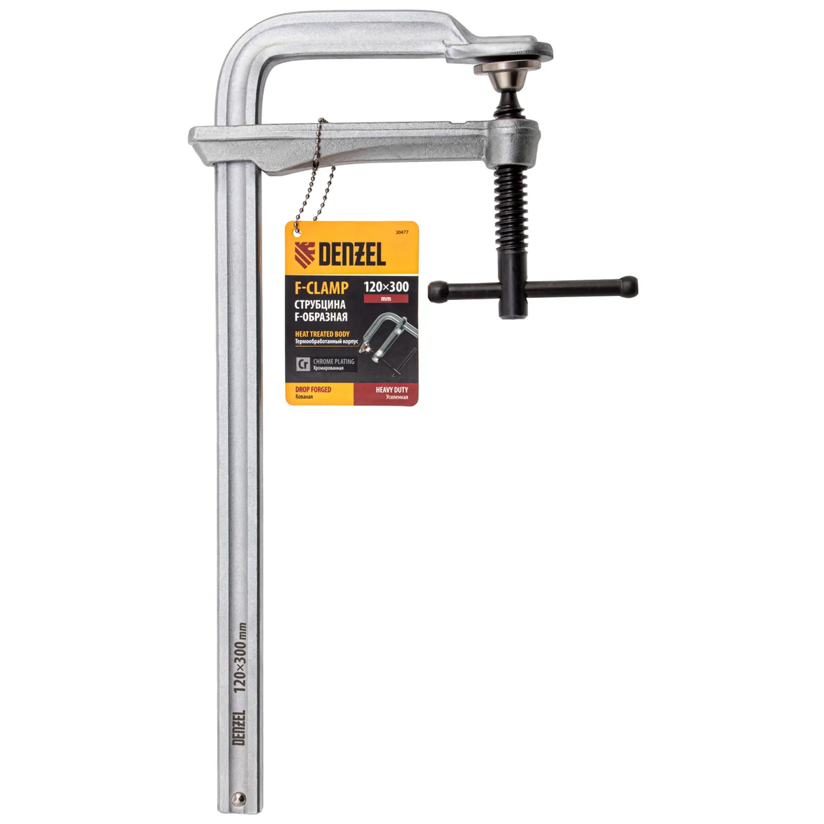 Кованая F-образная струбцина Denzel 20477 с глубиной зажима 120 мм, усиленная, предназначена для фиксации деталей шириной до 300 мм и материалов при проведении слесарных, столярных и сварочных работ. Тавровый профиль обеспечивает устойчивость конструкции к изгибу, что позволяет фиксировать детали со значительным усилием. Струбцина , подходит для профессионального применения.Преимущества Корпус изготовлен из конструкционной стали 45 методом ковки и закален для большей прочности до твердости 38-42 HRC. Винт с трапециевидной резьбой передает усилие без закусываний и заеданий. Хромированное покрытие надежно защищает струбцину от коррозии.