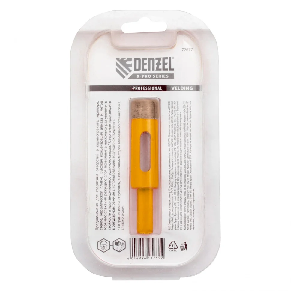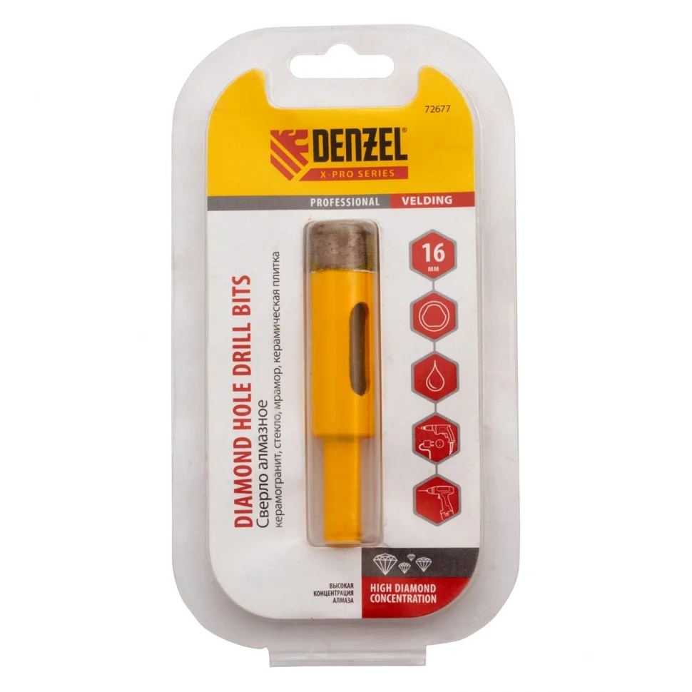 Алмазное сверло Denzel 72677 с 6-гранным хвостовиком, для мокрого резания, — режущий инструмент для получения точных отверстий диаметром 16 мм. Подходит для работ по стеклу, керамике, а также керамограниту и мрамору. Используется в качестве оснастки для дрелей и шуруповертов. Сверление с применением водяного охлаждения позволит избежать перегрева сверла и продлить срок его службы. Использование кондуктора 72830 препятствует смещению коронки и облегчает засверливание. Оснастка предназначена для профессионального использования.ПреимуществаСверло изготовлено из среднеуглеродистой стали марки 45, поэтому характеризуется прочностью и устойчивостью к повреждениям.Плотная концентрация алмазов в режущем слое увеличивает ресурс и производительность оснастки.Рабочий слой изготовлен методом горячего прессования, поэтому алмазы надежно удерживаются в связке — это обеспечивает устойчивость сверла к повышенным нагрузкам и позволяет сверлить керамогранит и мрамор.Шестигранный хвостовик надежно фиксируется в патроне электроинструмента, исключая проворачивание коронки.Лакокрасочное покрытие защищает оснастку от коррозии при мокром сверлении, продлевая срок ее службы.
