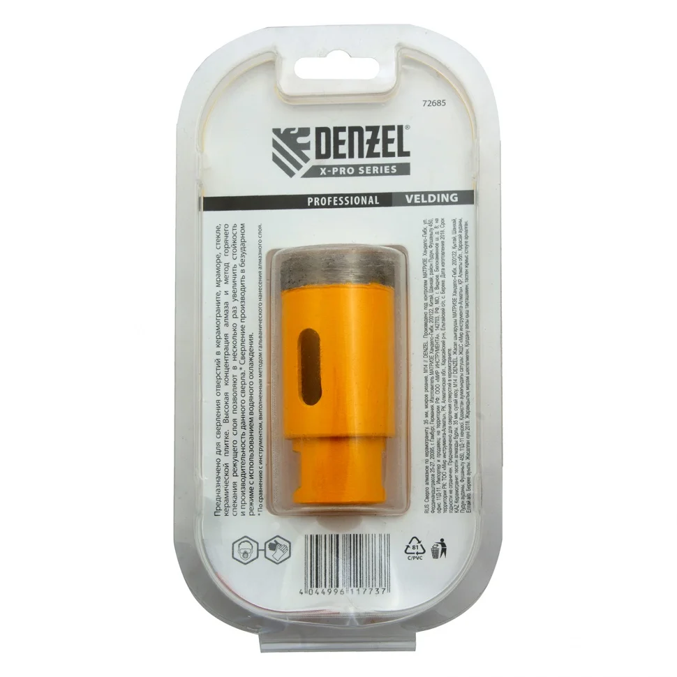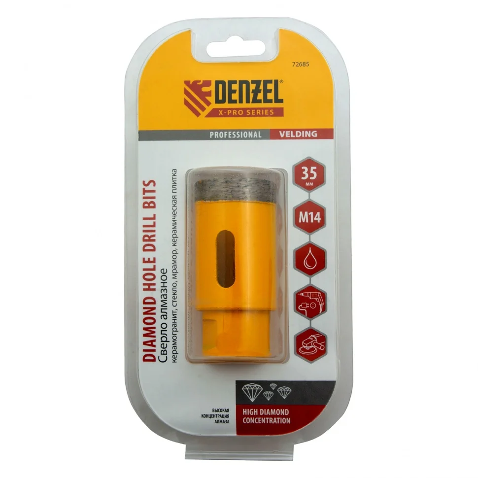 Алмазное сверло Denzel 72685, 35 мм, М14, предназначено для мокрого сверления по керамограниту, мрамору, стеклу и керамической плитке. Позволяет получать ровные отверстия без сколов, используется при проведении ремонтных и отделочных работ. Сверло (коронку) устанавливают на вал углошлифовальной машины, благодаря чему скорость сверления увеличивается в несколько раз по сравнению с дрелью или шуруповертом. Применение водяного охлаждения повышает срок службы оснастки. Чтобы точно позиционировать сверло при сверлении дрелью, рекомендуется использовать кондуктор Matrix 72830.ПреимуществаСверло выполнено из среднеуглеродистой стали марки 45, поэтому устойчиво к механическим нагрузкам и выдерживает длительное применение.Режущий слой изготовлен методом горячего спекания, что обеспечивает надежную фиксацию алмазов связкой и высокий ресурс оснастки.Благодаря увеличенной концентрации алмазов в рабочем слое коронка долго сохраняет режущую способность.На поверхность сверла нанесено лакокрасочное покрытие, обеспечивающее защиту от коррозии при мокром сверлении.При помощи переходника Matrix 76290 сверло можно установить на дрель или шуруповерт.