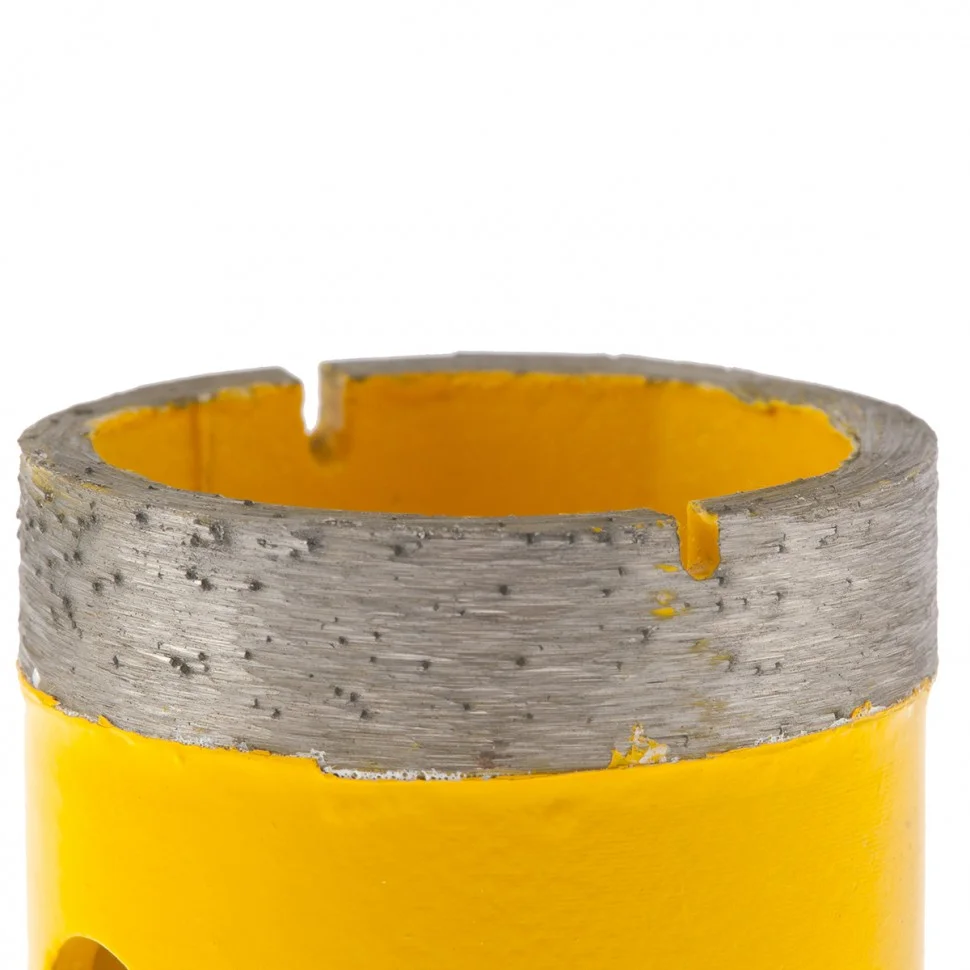 Алмазное сверло Denzel 72686, 38 мм, М14, предназначено для мокрого сверления по керамограниту, мрамору, стеклу и керамической плитке. Позволяет получать ровные отверстия без сколов, используется при проведении ремонтных и отделочных работ. Сверло (коронку) устанавливают на вал углошлифовальной машины, благодаря чему скорость сверления увеличивается в несколько раз по сравнению с дрелью или шуруповертом. Применение водяного охлаждения повышает срок службы оснастки. Чтобы точно позиционировать сверло при сверлении дрелью, рекомендуется использовать кондуктор Matrix 72830.ПреимуществаСверло выполнено из среднеуглеродистой стали марки 45, поэтому устойчиво к механическим нагрузкам и выдерживает длительное применение.Режущий слой изготовлен методом горячего спекания, что обеспечивает надежную фиксацию алмазов связкой и высокий ресурс оснастки.Благодаря увеличенной концентрации алмазов в рабочем слое коронка долго сохраняет режущую способность.На поверхность сверла нанесено лакокрасочное покрытие, обеспечивающее защиту от коррозии при мокром сверлении.При помощи переходника Matrix 76290 сверло можно установить на дрель или шуруповерт.