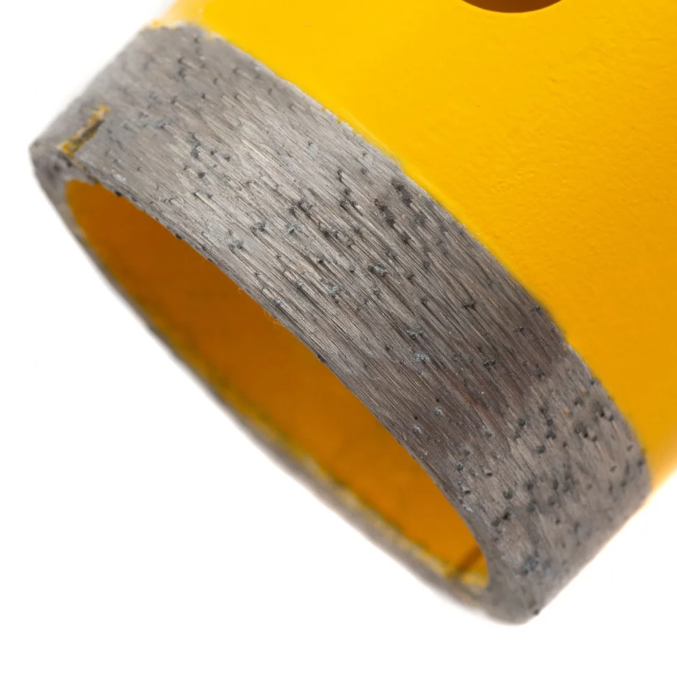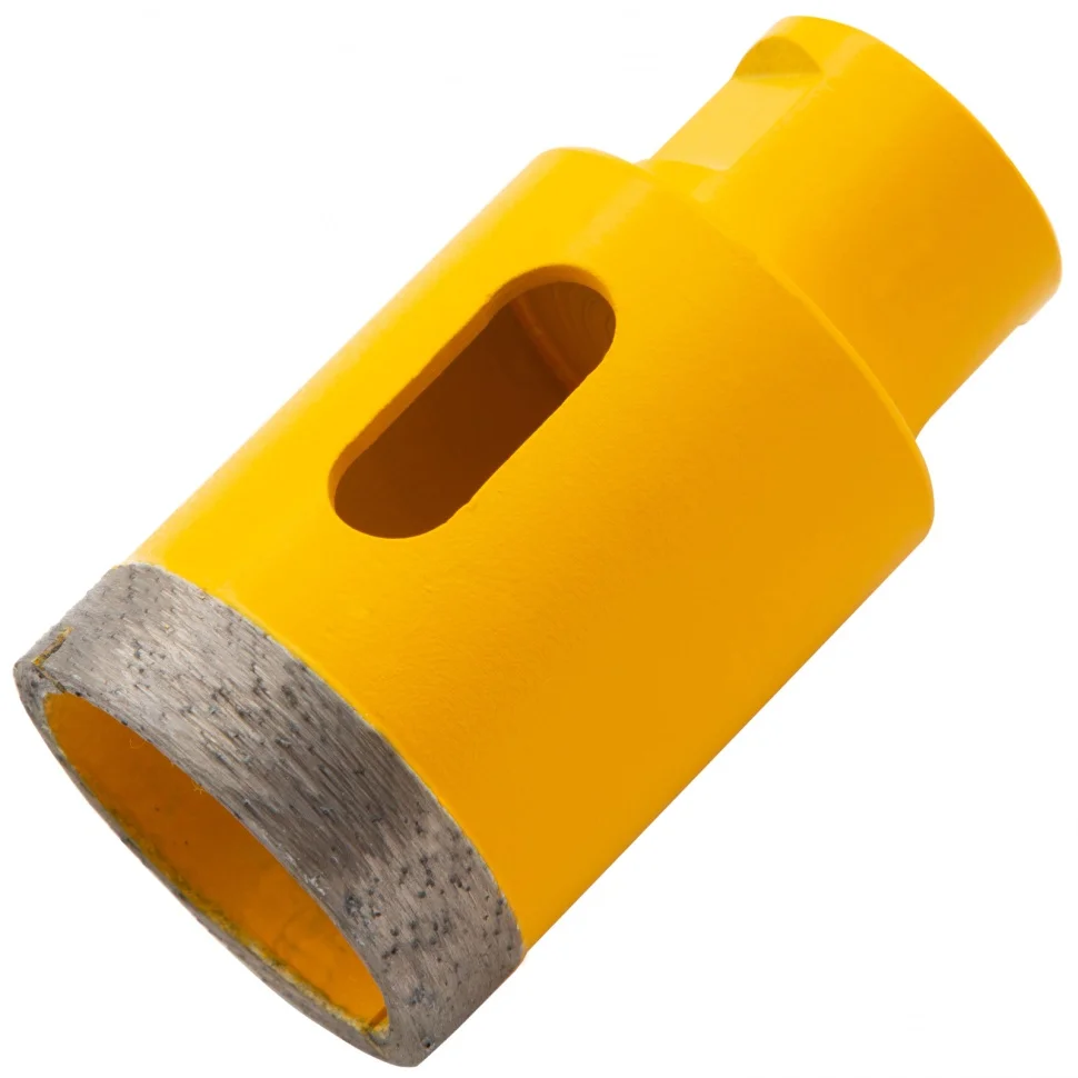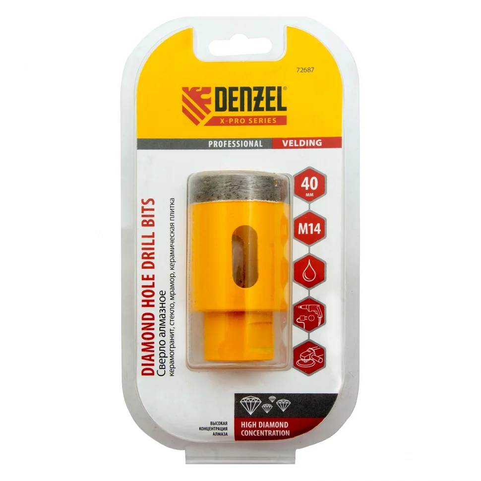 Алмазное сверло Denzel 72687, 40 мм, М14, предназначено для мокрого сверления по керамограниту, мрамору, стеклу и керамической плитке. Позволяет получать ровные отверстия без сколов, используется при проведении ремонтных и отделочных работ. Сверло (коронку) устанавливают на вал углошлифовальной машины, благодаря чему скорость сверления увеличивается в несколько раз по сравнению с дрелью или шуруповертом. Применение водяного охлаждения повышает срок службы оснастки. Чтобы точно позиционировать сверло при сверлении дрелью, рекомендуется использовать кондуктор Matrix 72830.ПреимуществаСверло выполнено из среднеуглеродистой стали марки 45, поэтому устойчиво к механическим нагрузкам и выдерживает длительное применение.Режущий слой изготовлен методом горячего спекания, что обеспечивает надежную фиксацию алмазов связкой и высокий ресурс оснастки.Благодаря увеличенной концентрации алмазов в рабочем слое коронка долго сохраняет режущую способность.На поверхность сверла нанесено лакокрасочное покрытие, обеспечивающее защиту от коррозии при мокром сверлении.При помощи переходника Matrix 76290 сверло можно установить на дрель или шуруповерт.