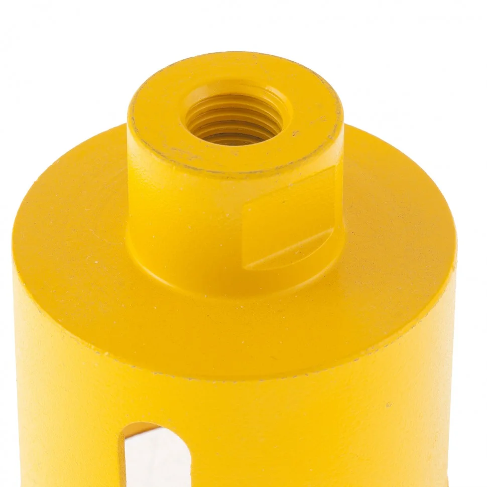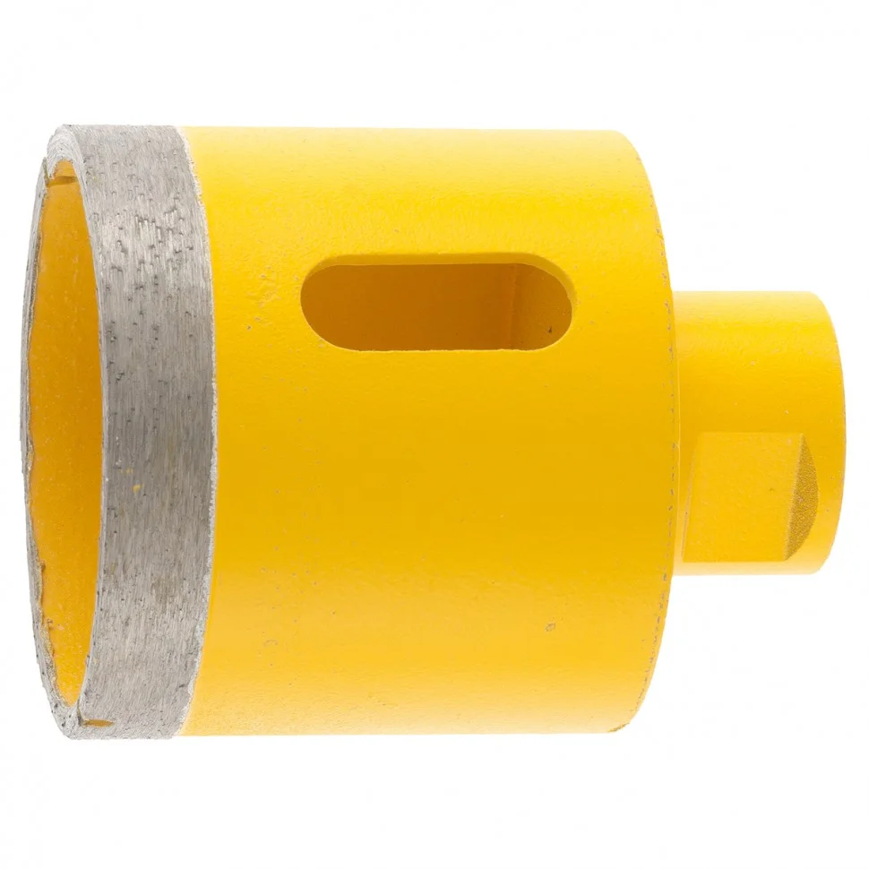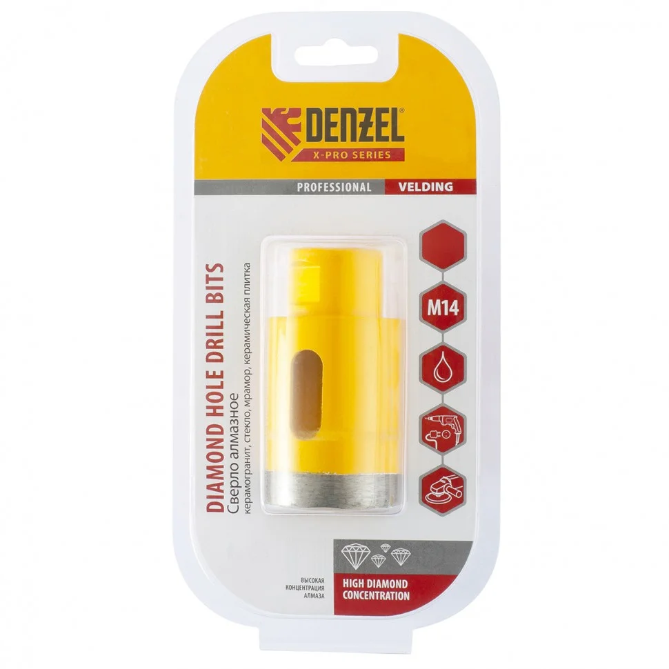 Алмазное сверло Denzel 72691, 60 мм, М14, предназначено для мокрого сверления по керамограниту, мрамору, стеклу и керамической плитке. Позволяет получать ровные отверстия без сколов, используется при проведении ремонтных и отделочных работ. Сверло (коронку) устанавливают на вал углошлифовальной машины, благодаря чему скорость сверления увеличивается в несколько раз по сравнению с дрелью или шуруповертом. Применение водяного охлаждения повышает срок службы оснастки. Чтобы точно позиционировать сверло при сверлении дрелью, рекомендуется использовать кондуктор Matrix 72830.ПреимуществаСверло выполнено из среднеуглеродистой стали марки 45, поэтому устойчиво к механическим нагрузкам и выдерживает длительное применение.Режущий слой изготовлен методом горячего спекания, что обеспечивает надежную фиксацию алмазов связкой и высокий ресурс оснастки.Благодаря увеличенной концентрации алмазов в рабочем слое коронка долго сохраняет режущую способность.На поверхность сверла нанесено лакокрасочное покрытие, обеспечивающее защиту от коррозии при мокром сверлении.При помощи переходника Matrix 76290 сверло можно установить на дрель или шуруповерт.