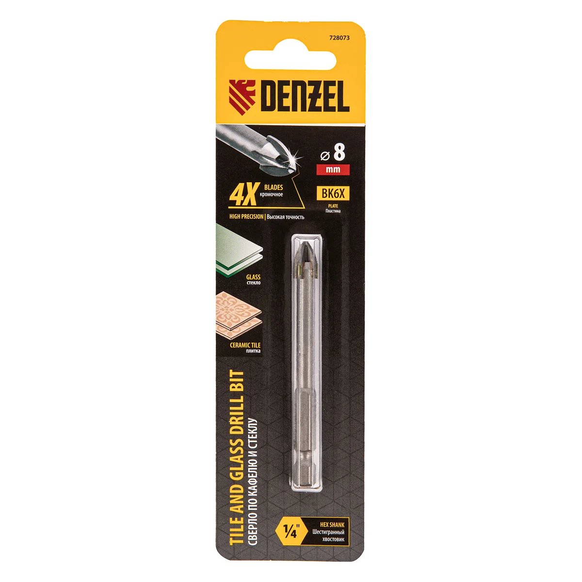 Сверло по керамической плитке 8 мм, крестовая пластина, шестигранный хвостовик// Denzel 728073
