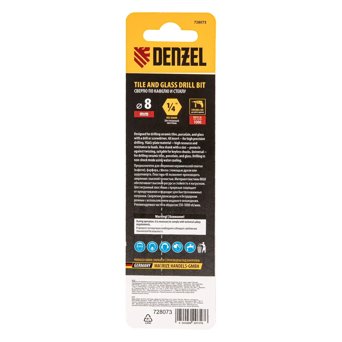 Сверло Denzel 728073, 8 мм, с крестовой пластинкой и шестигранным хвостовиком, рассчитано на сверление керамической плитки, стекла, мрамора и фарфора. Благодаря 4-гранной режущей пластине оно обеспечивает высокую скорость засверливания. Сверло подходит для интенсивного профессионального использования. В процессе работы рекомендуется применять водяное охлаждение для увеличения ресурса сверла.Преимущества Универссальность - предназначено для сверления керамической (кафельной) плитки, стекла, мрамора, фарфора. Высокий ресурс - режущая пластина изготовлена из износостойкого сплава YG6X Точное сверление - крестовая пластина с алмазной заточкой обеспечивает легкое засверливание и точное позиционирование сверла относительно оси сверления. Комфортная работа - сверло имеет 6-гранный хвостовик с прорезью (Е6,, который не прокручивается в патроне, а установка сверла в быстрозажимной патрон занимает всего несколько секунд.