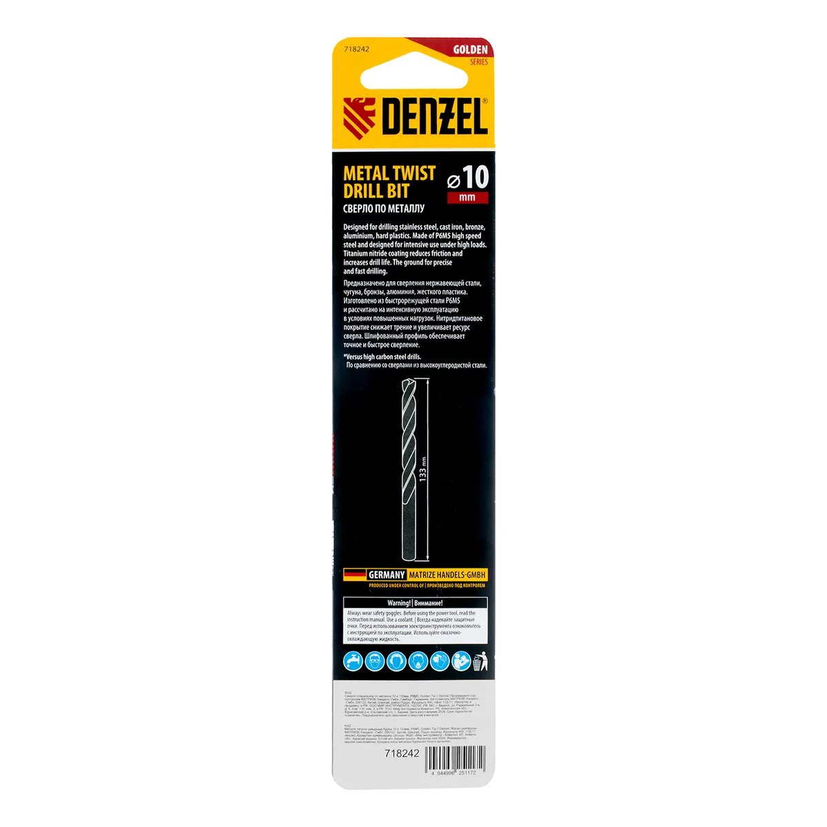 Сверло спиральное по металлу 10 x 133 мм, Р6М5, Golden Tip Denzel 718242