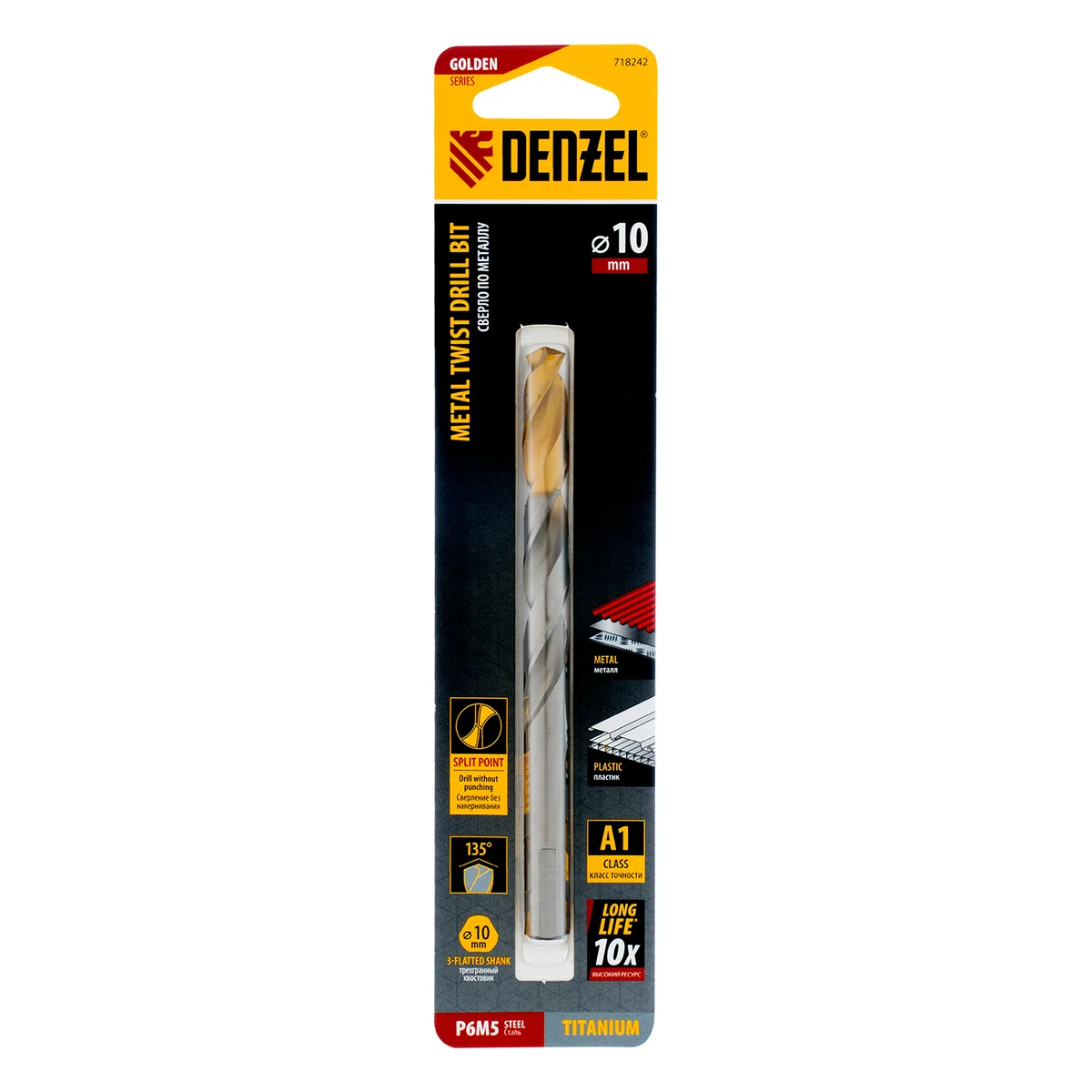 Спиральное сверло по металлу Denzel Golden Tip 718242 из стали P6M5, размером 10 х 133 мм, предназначено для получения отверстий в легированных и цветных металлах — меди, алюминии, мягкой бронзе, титане, латуни. Оснастка позволяет эффективно справляться с поставленными задачами благодаря оптимальному углу заточки 135°. Класс точности A гарантирует высокое качество полученных отверстий. Сверло используется для проведения монтажно-сборочных работ.