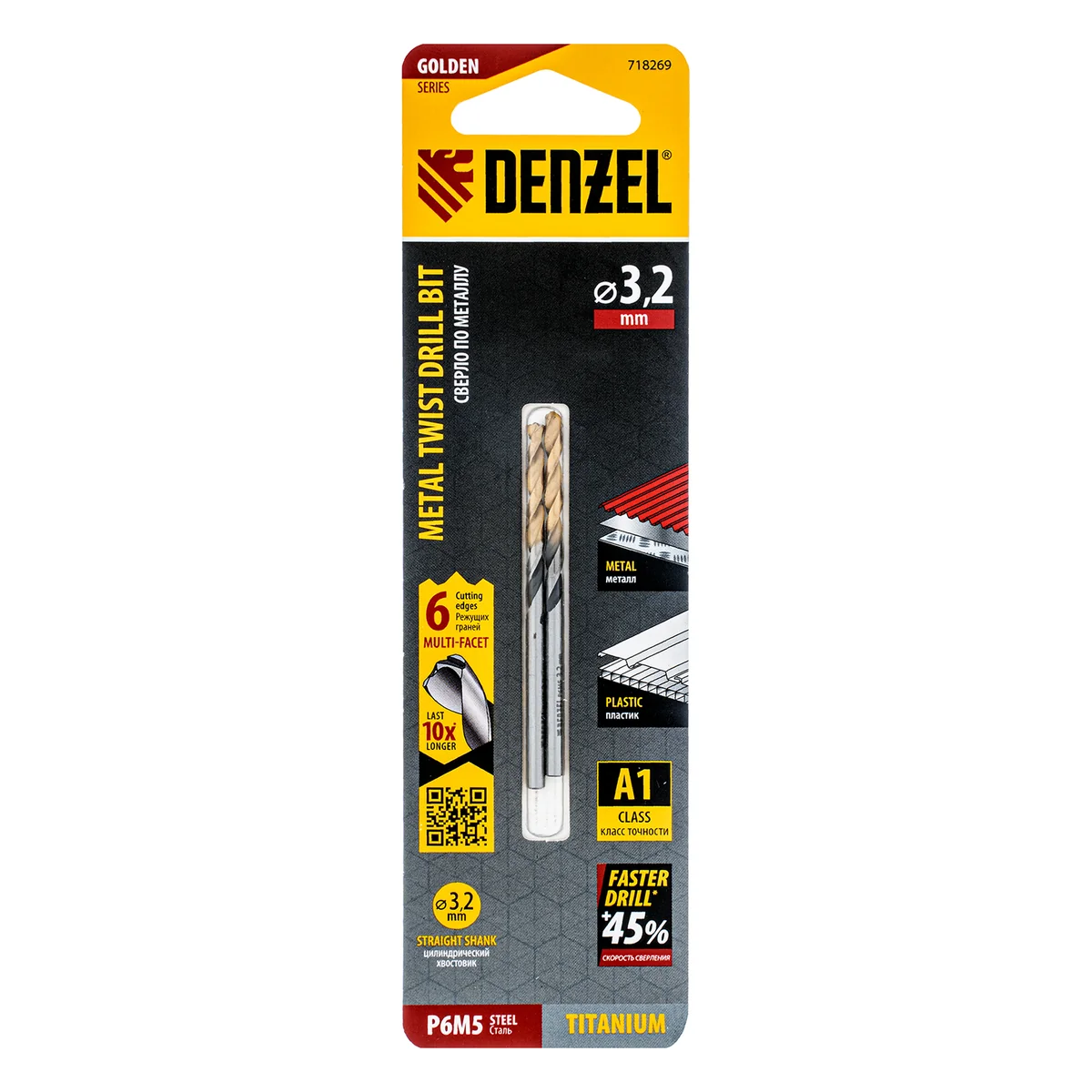 Спиральное сверло по металлу Denzel Golden Tip 718269 из стали P6M5, размером 3,2 х 65 мм, с многогранной заточкой, 2 штуки в упаковке, предназначено для получения отверстий в легированных сталях и цветных металлах. Многогранная заточка позволяет получать чистые и ровные отверстия практически без заусенцев. Сверлу присвоен класс точности A, что гарантирует высокое качество работ. Оснастка подходит для бытового и профессионального применения.