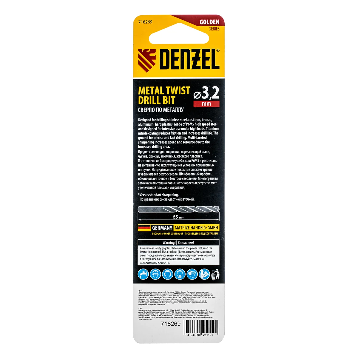 Сверло спиральное по металлу 3,2 x 65мм, Р6М5, Golden Tip, многогранная заточка, 2шт. Denzel 718269