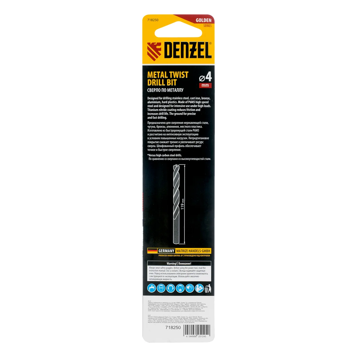 Сверло спиральное по металлу 4 х 119 мм, Р6М5, Golden Tip, удлиненное Denzel 718250