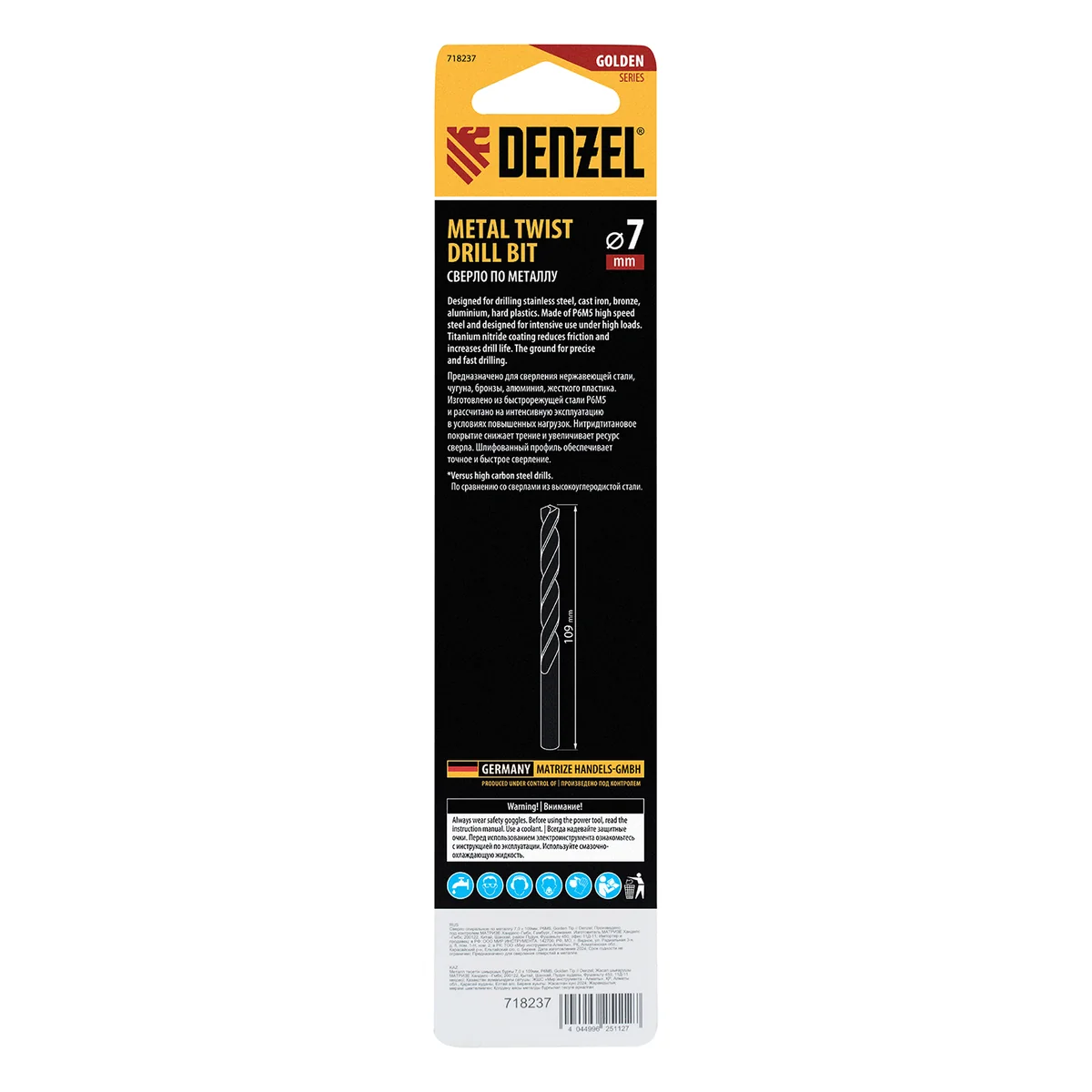 Сверло спиральное по металлу 7,0 x 109 мм, Р6М5, Golden Tip Denzel 718237