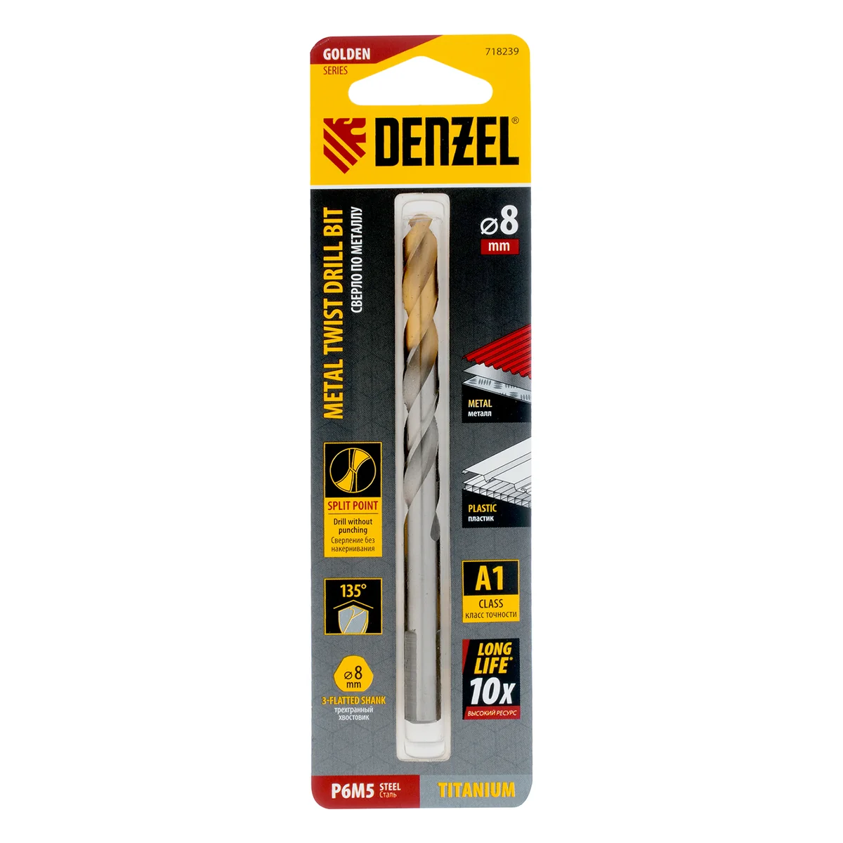 Спиральное сверло по металлу Denzel Golden Tip 718239 из стали P6M5, размером 8 х 117 мм, предназначено для получения отверстий в легированных и цветных металлах — меди, алюминии, мягкой бронзе, титане, латуни. Оснастка позволяет эффективно справляться с поставленными задачами благодаря оптимальному углу заточки 135°. Класс точности A гарантирует высокое качество полученных отверстий. Сверло используется для проведения монтажно-сборочных работ.