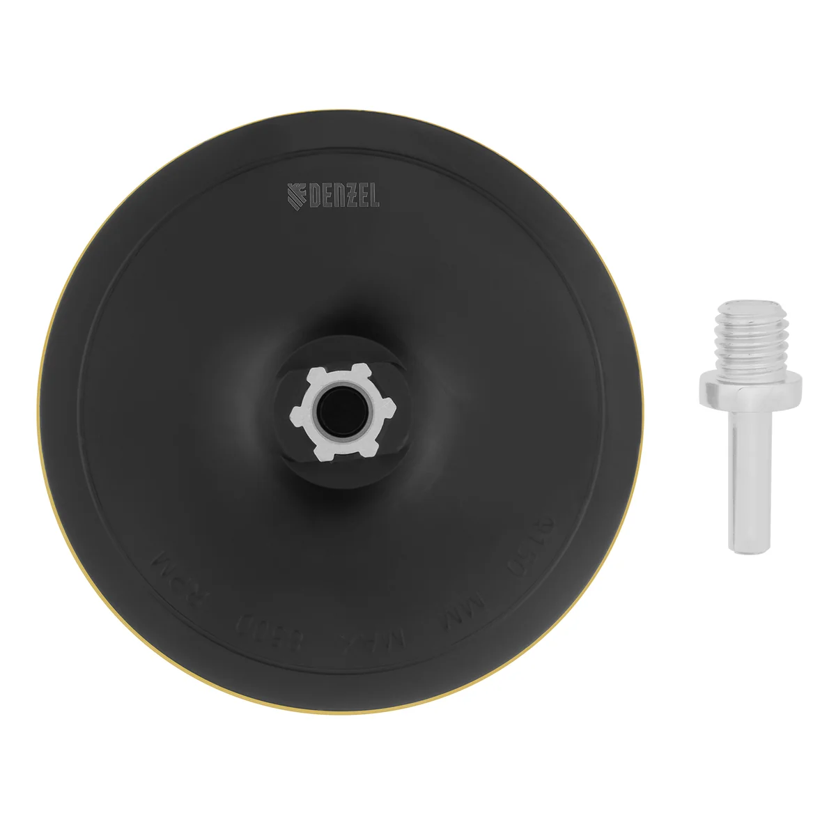Тарелка опорная Denzel 76255 диаметром 150 мм, с липучкой и адаптером с М14 на d8, твердая, устанавливается на дрель или углошлифовальную машину (УШМ). Используется для крепления абразивных или полировальных кругов на ворсовой основе, позволяет подготовить поверхность для дальнейшей обработки или придать ей финишную гладкость.