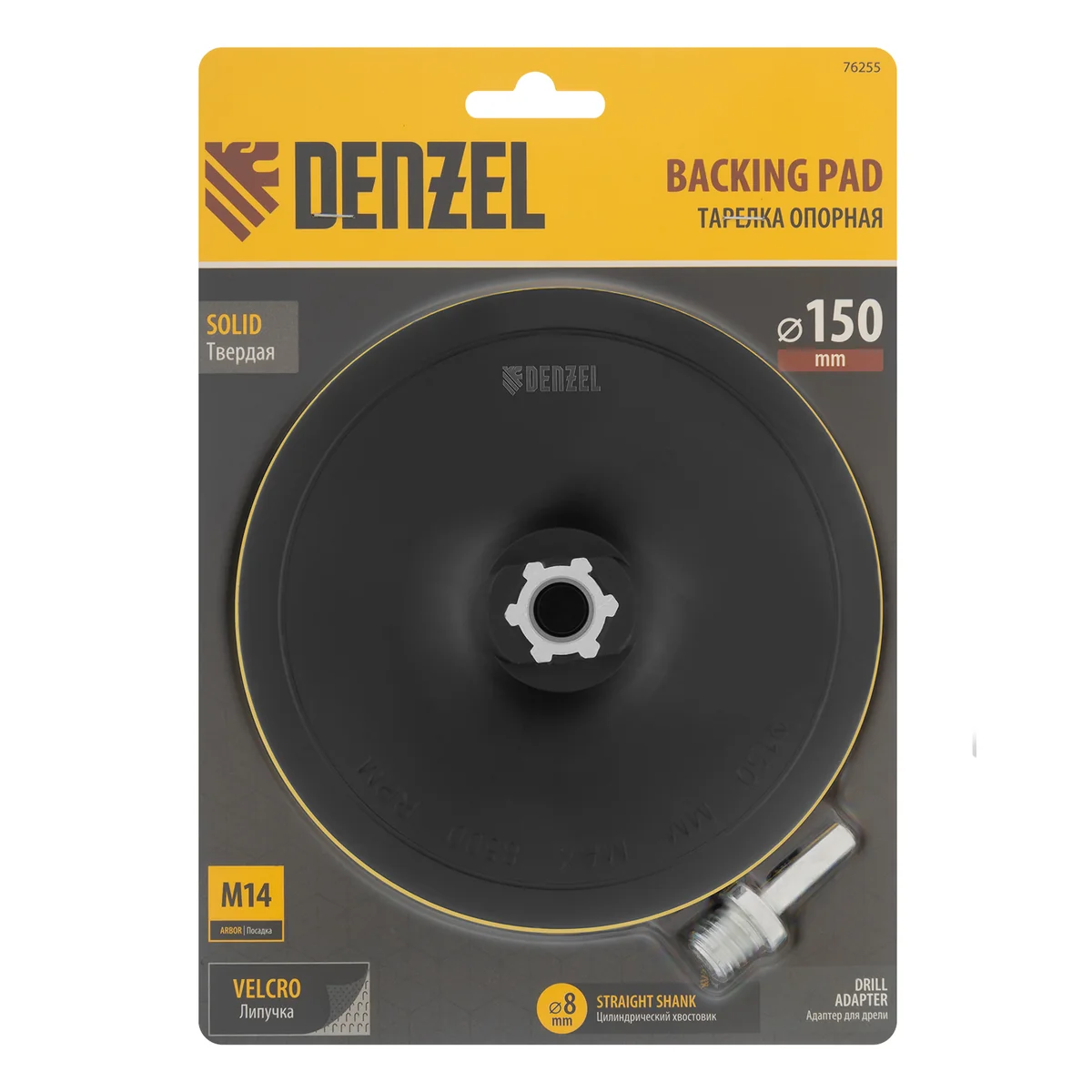 Тарелка опорная для дрели и УШМ с липучкой, 150 мм, твердая, с адаптером c М14 на d8 Denzel 76255