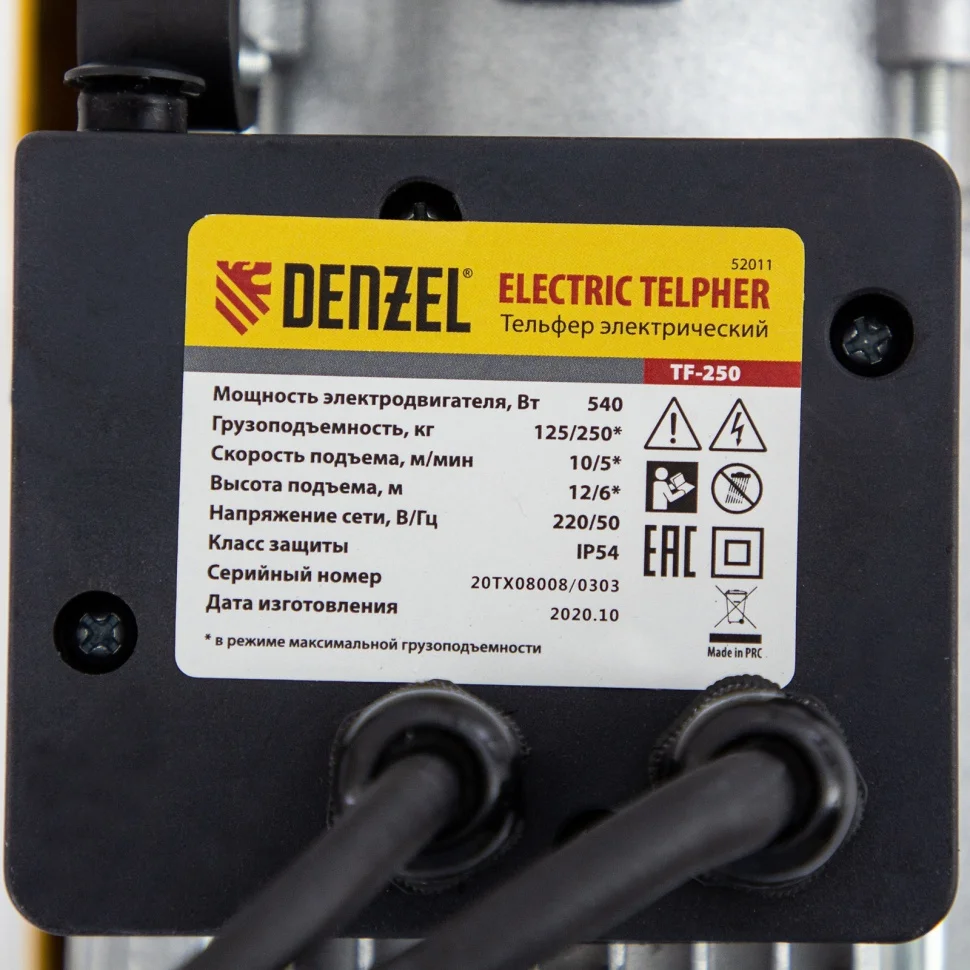 Электрический тельфер Denzel TF-250 52011 мощностью 540 Вт способен поднимать автомобильные двигатели, строительные материалы и другие грузы массой до 0,125 т напрямую и до 0,25 т с помощью блока полиспаста. Высота подъема составляет 6 м при использовании полиспаста и 12 м без него, скорость — 5 и 10 м/мин соответственно. Устройство пригодится в гараже, автомастерской или на строительной площадке. Полиспаст входит в комплект поставки.