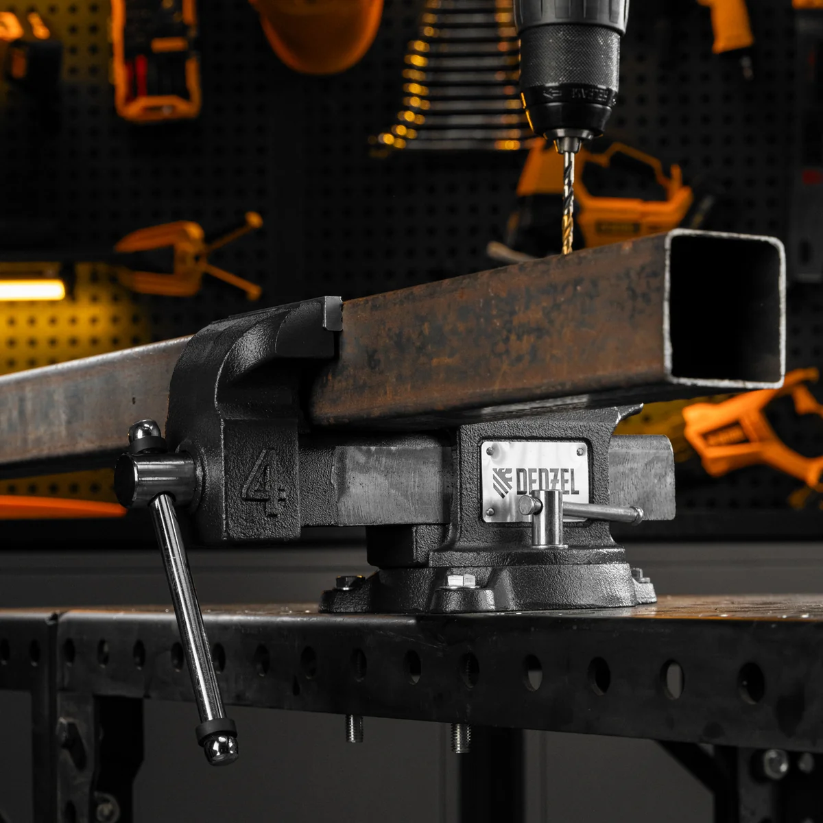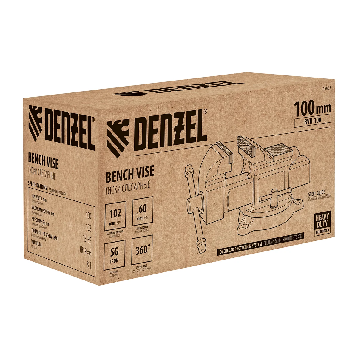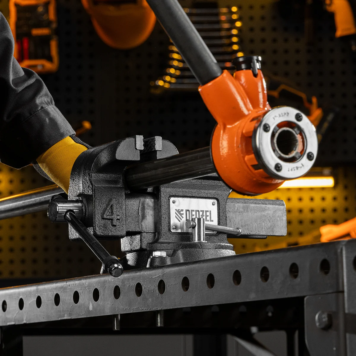 Слесарные поворотные тиски Denzel BVH-100 18683 с губками шириной 100 мм и стальной направляющей предназначены для фиксации деталей и заготовок, а также для выполнения мелких ударных работ — в конструкции предусмотрена наковальня. Рабочий ход составляет 100 мм, глубина зажима — 60 мм. Специальный зажим позволяет фиксировать трубы диаметром 15-35 мм, что расширяет возможности использования инструмента. На губки можно установить защитные накладки (приобретаются отдельно) для предотвращения повреждения зажимаемых предметов. Тиски поставляются с болтами для фиксации на рабочем столе и запасными штифтами-предохранителями. Пригодятся в мастерской и гараже.