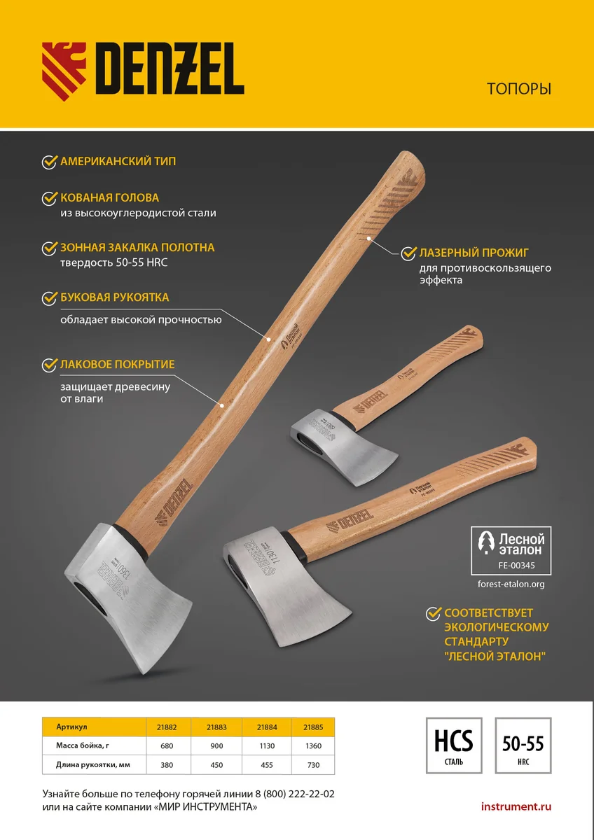 - Маркировка «Лесной эталон» — при изготовлении топорища использована древесина из сертифицированных лесов, полностью соблюдены требования, направленные на сохранение экологически ценных лесов.