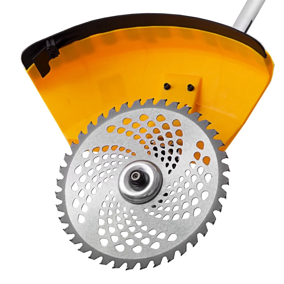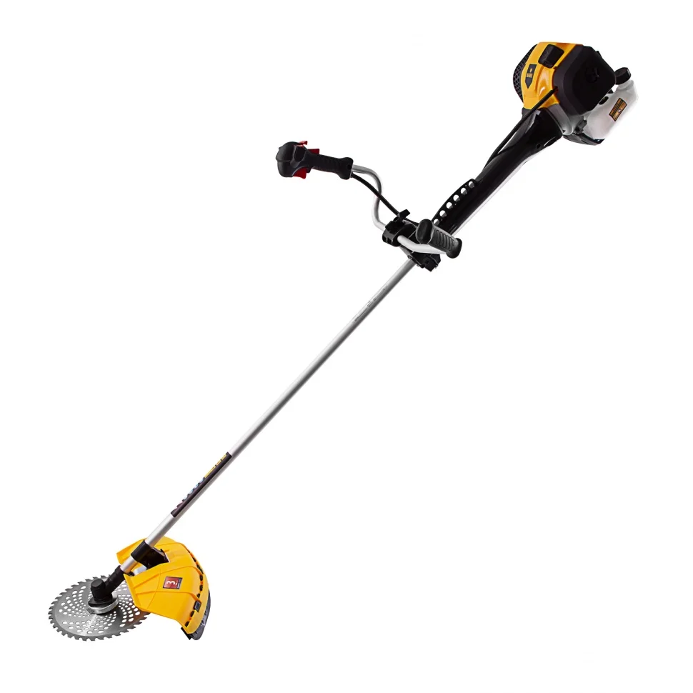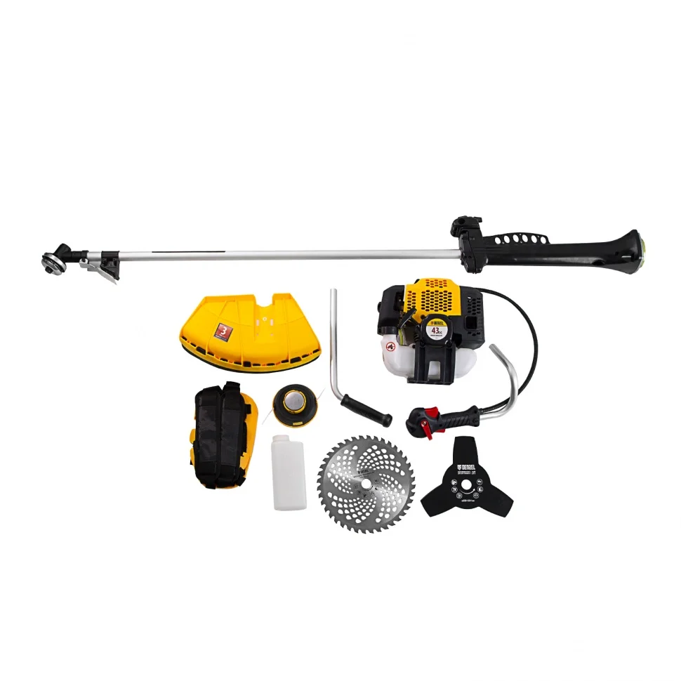 Бензиновый триммер Denzel DGT-43-PRO 96277, с двигателем объемом 43 куб. см, с системой анти-вибро и неразъемной штангой, поставляется комплектом из 2 частей и используется для скашивания травы, выравнивания газонов и удаления сорняков, кустарников и молодой поросли деревьев на садовом участке. Триммер эффективно справляется с этими задачами благодаря оснасткам — катушке с леской, трехлопастному ножу и пильному диску. За 1 час с его помощью можно обработать участок до 20 соток.Надежный двухтактный двигатель мощностью 2,5 л. с. обеспечивает скорость вращения оснастки 9500 об/мин, благодаря чему триммер эффективно борется с густой травой. Редуктор и корпус сцепления поставляются уже установленными на штангу, что упрощает процесс финальной сборки инструмента.ПреимуществаДолговечность — хромированный цилиндр двигателя и стартер из металла и ударопрочного полиамида обеспечивают стабильную работу мотокосы.Надежная конструкция — усиленное сцепление и закаленные шлицы трансмиссионного вала уменьшают риск поломки.Экономичность — расход топлива составляет 1,2 л/ч, поэтому бензотриммер способен проработать при полной нагрузке 40 минут без дозаправки.Прочность — штанга из алюминиевой трубы со стенками толщиной 1,5 мм не имеет уязвимых соединений, что обеспечивает ей устойчивость к нагрузкам.Легкий старт — система Easy Start и праймер обеспечивают быстрый запуск даже после долгого перерыва.Расширенный функционал — благодаря встроенному круиз-контролю с регулировкой оборотов можно легко подобрать оптимальный режим работы.Безопасность — защитный кожух из прочного пластика закрывает режущую часть, а блокиратор курка газа исключает случайный запуск двигателя.Быстрая установка и подача корда — благодаря системе Easy Load не нужно разбирать корпус катушки для заправки лески, а для ее обновления достаточно слегка ударить шпулей о землю.Удобное управление — все кнопки находятся на правой рукоятке, а клавиша выключения зажигания — под большим пальцем, поэтому можно моментально остановить работу при необходимости.Простое обслуживание — быстрый доступ к фильтру без ключа облегчает его замену.Виброзащита — профессиональная антивибрационная система гасит колебания, поэтому можно долго работать без усталости.Комфортная работа — двухплечевой ремень снижает нагрузку на позвоночник и плечи, а специальная пластина защищает бедро от ударов о штангу.Продуманная комплектация — к триммеру прилагается канистра для смешивания топлива и комплект ключей для сборки и обслуживания.Гарантия 3 года — надежность бензотриммера подтверждена производителем.
