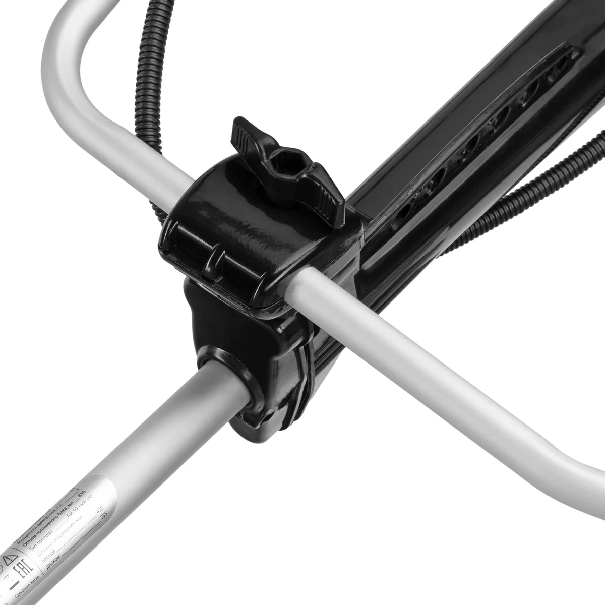 - Безопасность — защитный кожух из прочного пластика закрывает режущую часть, а блокиратор курка газа исключает случайный запуск двигателя.